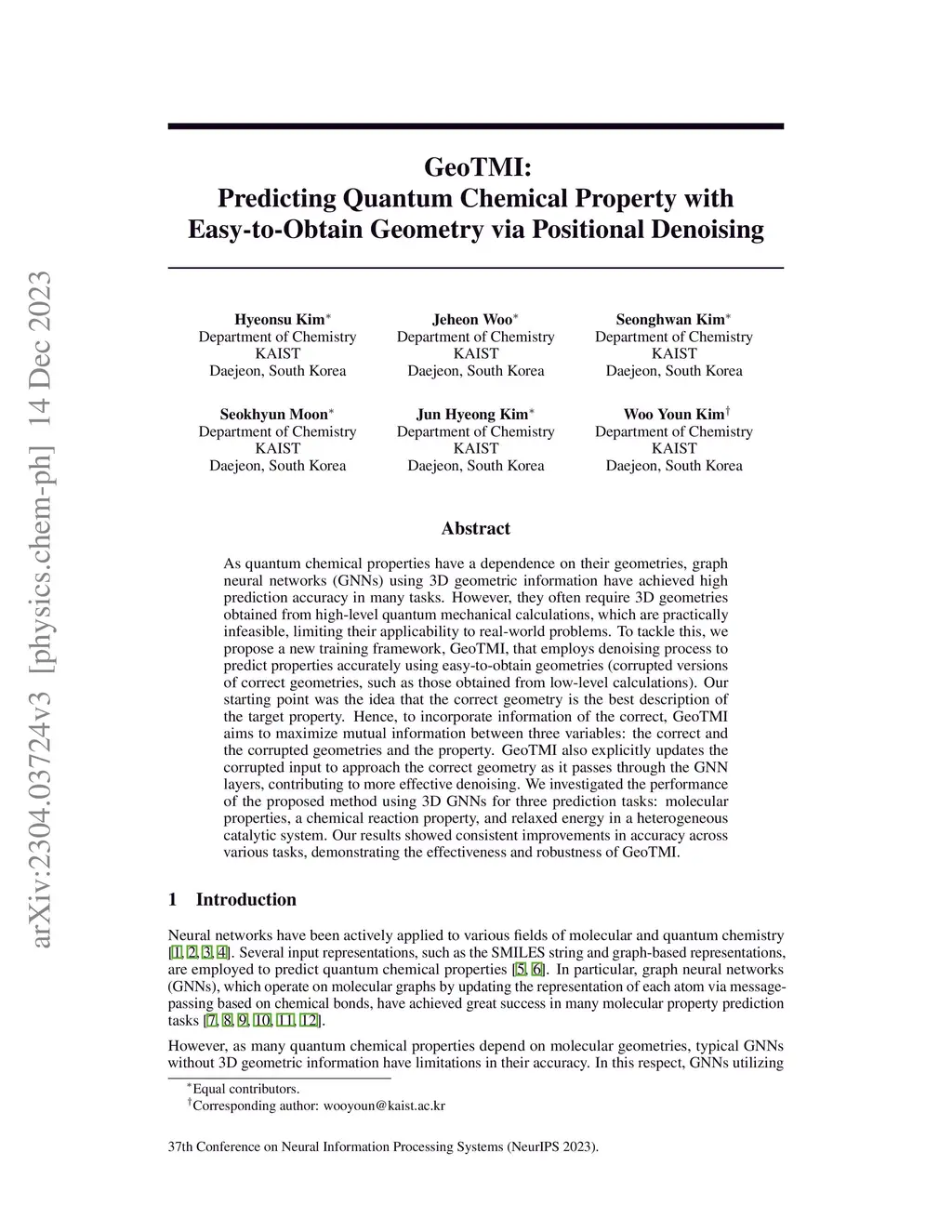 As quantum chemical properties have a dependence on their geometries, graph neural networks (GNNs) using 3D geometric information have achieved high prediction accuracy in many tasks. However, they often require 3D geometries obtained from high-level quantum mechanical calculations, which are practically infeasible, limiting their applicability to real-world problems. To tackle this, we propose a new training framework, GeoTMI, that employs denoising process to predict properties accurately using easy-to-obtain geometries (corrupted versions of correct geometries, such as those obtained from low-level calculations). Our starting point was the idea that the correct geometry is the best description of the target property. Hence, to incorporate information of the correct, GeoTMI aims to maximize mutual information between three variables: the correct and the corrupted geometries and the property. GeoTMI also explicitly updates the corrupted input to approach the correct geometry as it passes through the GNN layers, contributing to more effective denoising. We investigated the performance of the proposed method using 3D GNNs for three prediction tasks: molecular properties, a chemical reaction property, and relaxed energy in a heterogeneous catalytic system. Our results showed consistent improvements in accuracy across various tasks, demonstrating the effectiveness and robustness of GeoTMI.