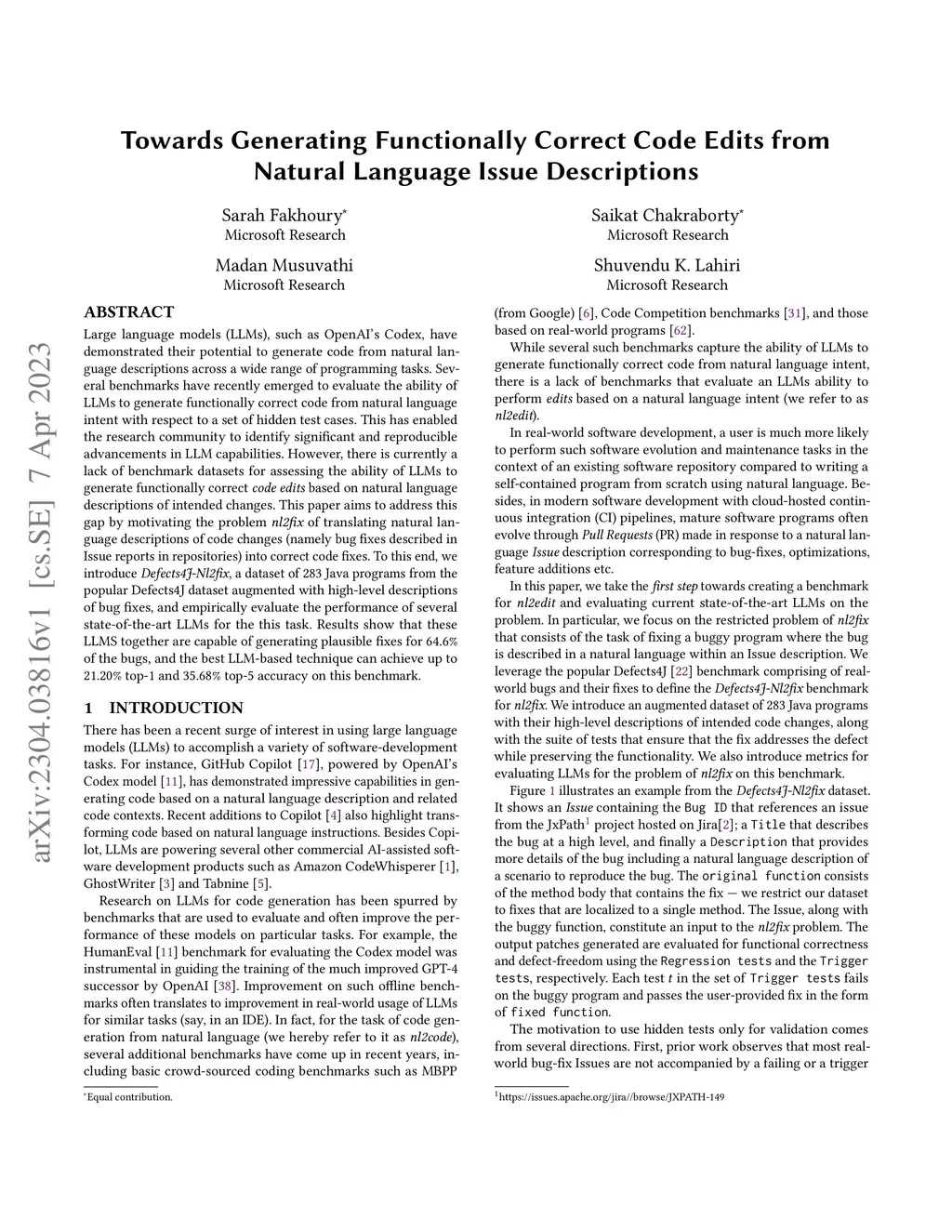 Large language models (LLMs), such as OpenAI's Codex, have demonstrated their potential to generate code from natural language descriptions across a wide range of programming tasks. Several benchmarks have recently emerged to evaluate the ability of LLMs to generate functionally correct code from natural language intent with respect to a set of hidden test cases. This has enabled the research community to identify significant and reproducible advancements in LLM capabilities. However, there is currently a lack of benchmark datasets for assessing the ability of LLMs to generate functionally correct code edits based on natural language descriptions of intended changes. This paper aims to address this gap by motivating the problem NL2Fix of translating natural language descriptions of code changes (namely bug fixes described in Issue reports in repositories) into correct code fixes. To this end, we introduce Defects4J-NL2Fix, a dataset of 283 Java programs from the popular Defects4J dataset augmented with high-level descriptions of bug fixes, and empirically evaluate the performance of several state-of-the-art LLMs for the this task. Results show that these LLMS together are capable of generating plausible fixes for 64.6% of the bugs, and the best LLM-based technique can achieve up to 21.20% top-1 and 35.68% top-5 accuracy on this benchmark.