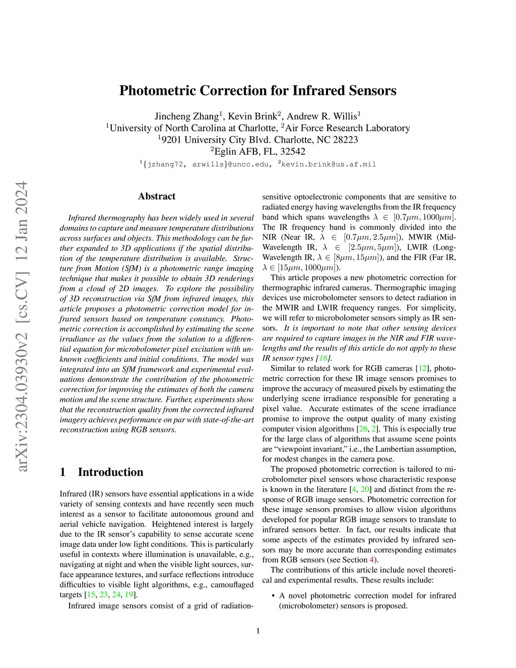 Infrared thermography has been widely used in several domains to capture and measure temperature distributions across surfaces and objects. This methodology can be further expanded to 3D applications if the spatial distribution of the temperature distribution is available. Structure from Motion (SfM) is a photometric range imaging technique that makes it possible to obtain 3D renderings from a cloud of 2D images. To explore the possibility of 3D reconstruction via SfM from infrared images, this article proposes a photometric correction model for infrared sensors based on temperature constancy. Photometric correction is accomplished by estimating the scene irradiance as the values from the solution to a differential equation for microbolometer pixel excitation with unknown coefficients and initial conditions. The model was integrated into an SfM framework and experimental evaluations demonstrate the contribution of the photometric correction for improving the estimates of both the camera motion and the scene structure. Further, experiments show that the reconstruction quality from the corrected infrared imagery achieves performance on par with state-of-the-art reconstruction using RGB sensors.
