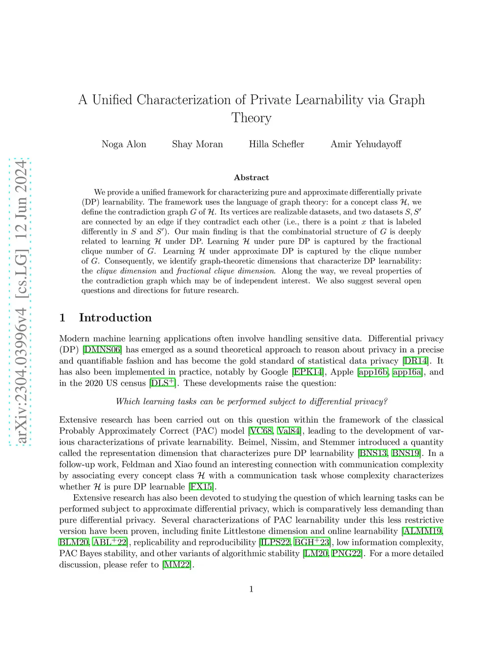 We provide a unified framework for characterizing pure and approximate differentially private (DP) learnability. The framework uses the language of graph theory: for a concept class , we define the contradiction graph of . Its vertices are realizable datasets, and two datasets are connected by an edge if they contradict each other (i.e., there is a point that is labeled differently in and ). Our main finding is that the combinatorial structure of is deeply related to learning under DP. Learning under pure DP is captured by the fractional clique number of . Learning under approximate DP is captured by the clique number of . Consequently, we identify graph-theoretic dimensions that characterize DP learnability: the clique dimension and fractional clique dimension. Along the way, we reveal properties of the contradiction graph which may be of independent interest. We also suggest several open questions and directions for future research.