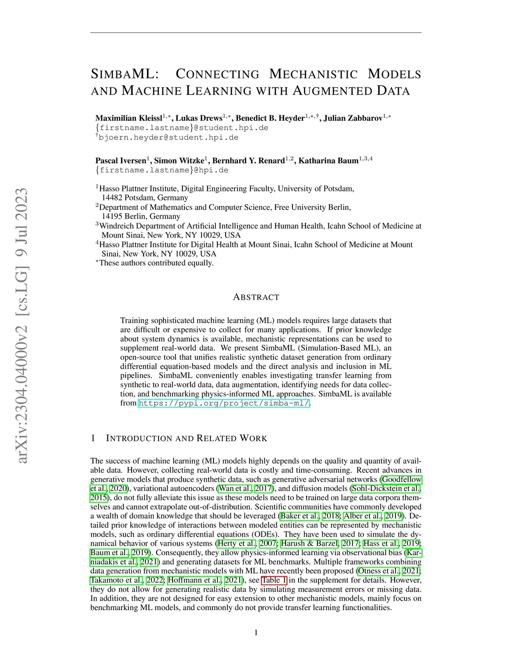 Training sophisticated machine learning (ML) models requires large datasets that are difficult or expensive to collect for many applications. If prior knowledge about system dynamics is available, mechanistic representations can be used to supplement real-world data. We present SimbaML (Simulation-Based ML), an open-source tool that unifies realistic synthetic dataset generation from ordinary differential equation-based models and the direct analysis and inclusion in ML pipelines. SimbaML conveniently enables investigating transfer learning from synthetic to real-world data, data augmentation, identifying needs for data collection, and benchmarking physics-informed ML approaches. SimbaML is available from https://pypi.org/project/simba-ml/.