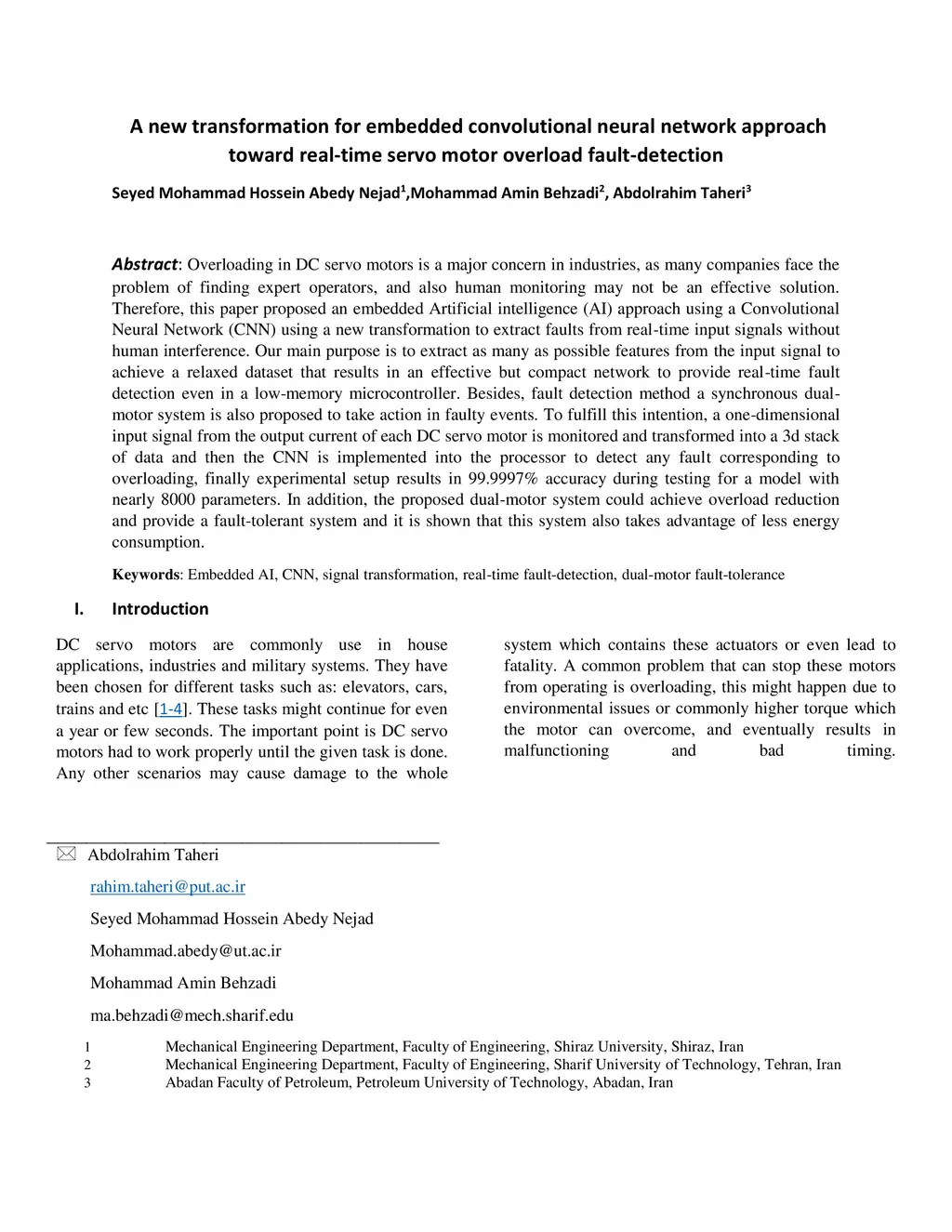 Overloading in DC servo motors is a major concern in industries, as many companies face the problem of finding expert operators, and also human monitoring may not be an effective solution. Therefore, this paper proposed an embedded Artificial intelligence (AI) approach using a Convolutional Neural Network (CNN) using a new transformation to extract faults from real-time input signals without human interference. Our main purpose is to extract as many as possible features from the input signal to achieve a relaxed dataset that results in an effective but compact network to provide real-time fault detection even in a low-memory microcontroller. Besides, fault detection method a synchronous dual-motor system is also proposed to take action in faulty events. To fulfill this intention, a one-dimensional input signal from the output current of each DC servo motor is monitored and transformed into a 3d stack of data and then the CNN is implemented into the processor to detect any fault corresponding to overloading, finally experimental setup results in 99.9997% accuracy during testing for a model with nearly 8000 parameters. In addition, the proposed dual-motor system could achieve overload reduction and provide a fault-tolerant system and it is shown that this system also takes advantage of less energy consumption.