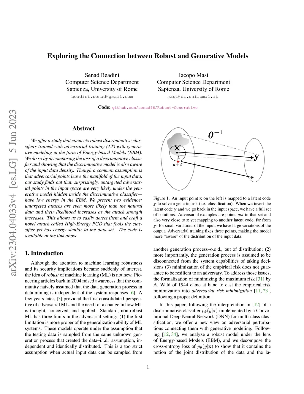 We offer a study that connects robust discriminative classifiers trained with adversarial training (AT) with generative modeling in the form of Energy-based Models (EBM). We do so by decomposing the loss of a discriminative classifier and showing that the discriminative model is also aware of the input data density. Though a common assumption is that adversarial points leave the manifold of the input data, our study finds out that, surprisingly, untargeted adversarial points in the input space are very likely under the generative model hidden inside the discriminative classifier -- have low energy in the EBM. We present two evidence: untargeted attacks are even more likely than the natural data and their likelihood increases as the attack strength increases. This allows us to easily detect them and craft a novel attack called High-Energy PGD that fools the classifier yet has energy similar to the data set. The code is available at github.com/senad96/Robust-Generative