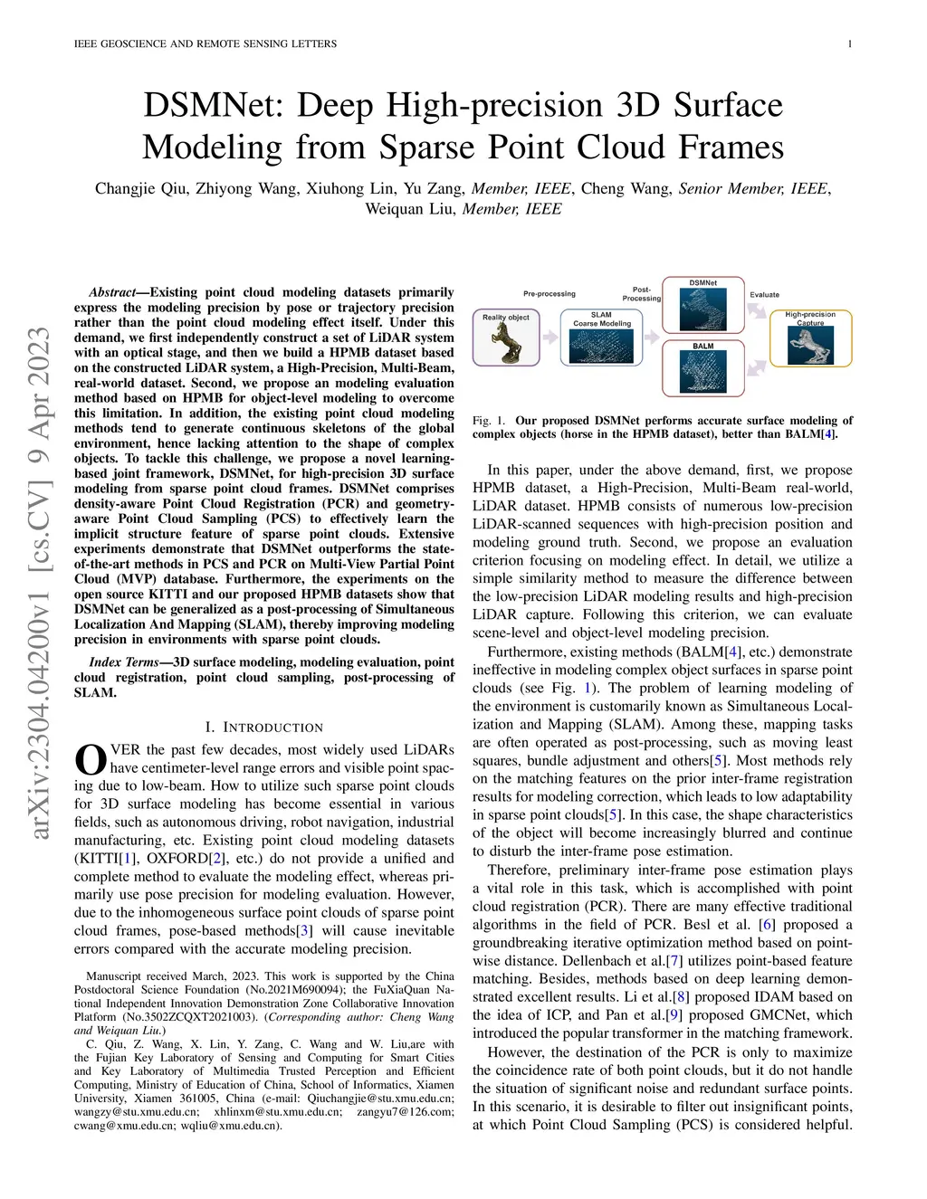 Existing point cloud modeling datasets primarily express the modeling precision by pose or trajectory precision rather than the point cloud modeling effect itself. Under this demand, we first independently construct a set of LiDAR system with an optical stage, and then we build a HPMB dataset based on the constructed LiDAR system, a High-Precision, Multi-Beam, real-world dataset. Second, we propose an modeling evaluation method based on HPMB for object-level modeling to overcome this limitation. In addition, the existing point cloud modeling methods tend to generate continuous skeletons of the global environment, hence lacking attention to the shape of complex objects. To tackle this challenge, we propose a novel learning-based joint framework, DSMNet, for high-precision 3D surface modeling from sparse point cloud frames. DSMNet comprises density-aware Point Cloud Registration (PCR) and geometry-aware Point Cloud Sampling (PCS) to effectively learn the implicit structure feature of sparse point clouds. Extensive experiments demonstrate that DSMNet outperforms the state-of-the-art methods in PCS and PCR on Multi-View Partial Point Cloud (MVP) database. Furthermore, the experiments on the open source KITTI and our proposed HPMB datasets show that DSMNet can be generalized as a post-processing of Simultaneous Localization And Mapping (SLAM), thereby improving modeling precision in environments with sparse point clouds.