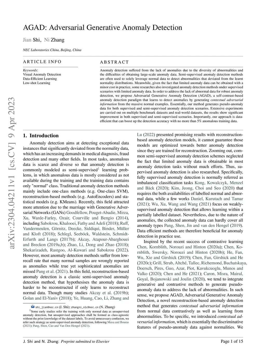 Anomaly detection suffered from the lack of anomalies due to the diversity of abnormalities and the difficulties of obtaining large-scale anomaly data. Semi-supervised anomaly detection methods are often used to solely leverage normal data to detect abnormalities that deviated from the learnt normality distributions. Meanwhile, given the fact that limited anomaly data can be obtained with a minor cost in practice, some researches also investigated anomaly detection methods under supervised scenarios with limited anomaly data. In order to address the lack of abnormal data for robust anomaly detection, we propose Adversarial Generative Anomaly Detection (AGAD), a self-contrast-based anomaly detection paradigm that learns to detect anomalies by generating \textit{contextual adversarial information} from the massive normal examples. Essentially, our method generates pseudo-anomaly data for both supervised and semi-supervised anomaly detection scenarios. Extensive experiments are carried out on multiple benchmark datasets and real-world datasets, the results show significant improvement in both supervised and semi-supervised scenarios. Importantly, our approach is data-efficient that can boost up the detection accuracy with no more than 5% anomalous training data.