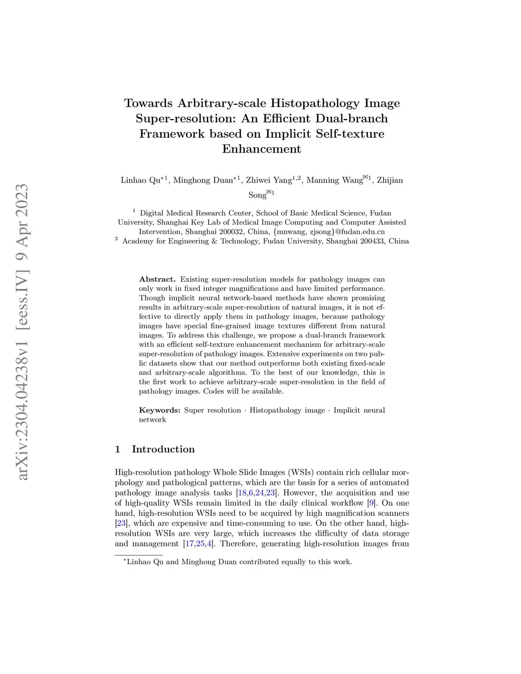 Existing super-resolution models for pathology images can only work in fixed integer magnifications and have limited performance. Though implicit neural network-based methods have shown promising results in arbitrary-scale super-resolution of natural images, it is not effective to directly apply them in pathology images, because pathology images have special fine-grained image textures different from natural images. To address this challenge, we propose a dual-branch framework with an efficient self-texture enhancement mechanism for arbitrary-scale super-resolution of pathology images. Extensive experiments on two public datasets show that our method outperforms both existing fixed-scale and arbitrary-scale algorithms. To the best of our knowledge, this is the first work to achieve arbitrary-scale super-resolution in the field of pathology images. Codes will be available.