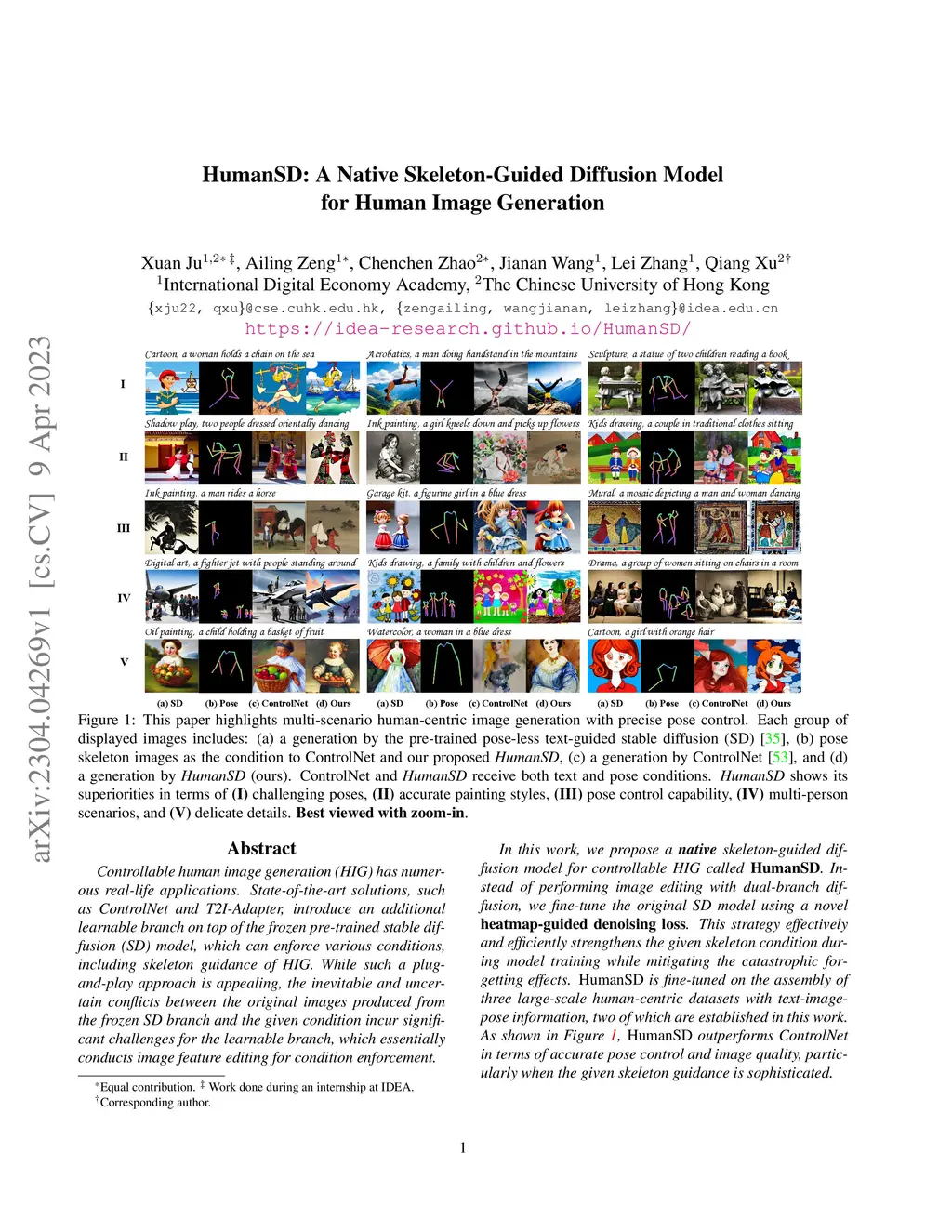 Controllable human image generation (HIG) has numerous real-life applications. State-of-the-art solutions, such as ControlNet and T2I-Adapter, introduce an additional learnable branch on top of the frozen pre-trained stable diffusion (SD) model, which can enforce various conditions, including skeleton guidance of HIG. While such a plug-and-play approach is appealing, the inevitable and uncertain conflicts between the original images produced from the frozen SD branch and the given condition incur significant challenges for the learnable branch, which essentially conducts image feature editing for condition enforcement. In this work, we propose a native skeleton-guided diffusion model for controllable HIG called HumanSD. Instead of performing image editing with dual-branch diffusion, we fine-tune the original SD model using a novel heatmap-guided denoising loss. This strategy effectively and efficiently strengthens the given skeleton condition during model training while mitigating the catastrophic forgetting effects. HumanSD is fine-tuned on the assembly of three large-scale human-centric datasets with text-image-pose information, two of which are established in this work. As shown in Figure 1, HumanSD outperforms ControlNet in terms of accurate pose control and image quality, particularly when the given skeleton guidance is sophisticated.