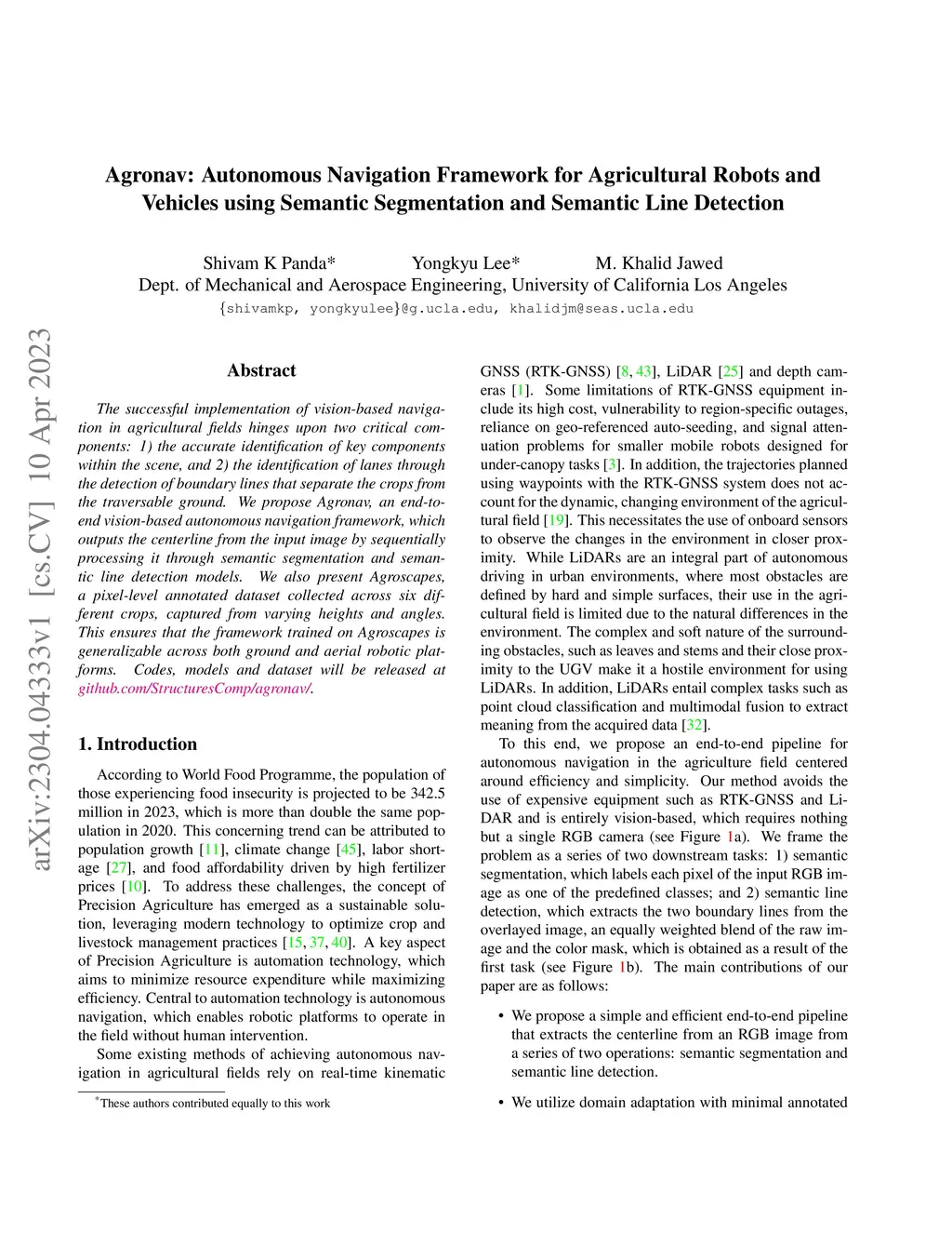 The successful implementation of vision-based navigation in agricultural fields hinges upon two critical components: 1) the accurate identification of key components within the scene, and 2) the identification of lanes through the detection of boundary lines that separate the crops from the traversable ground. We propose Agronav, an end-to-end vision-based autonomous navigation framework, which outputs the centerline from the input image by sequentially processing it through semantic segmentation and semantic line detection models. We also present Agroscapes, a pixel-level annotated dataset collected across six different crops, captured from varying heights and angles. This ensures that the framework trained on Agroscapes is generalizable across both ground and aerial robotic platforms. Codes, models and dataset will be released at \href{https://github.com/shivamkumarpanda/agronav}{github.com/shivamkumarpanda/agronav}.