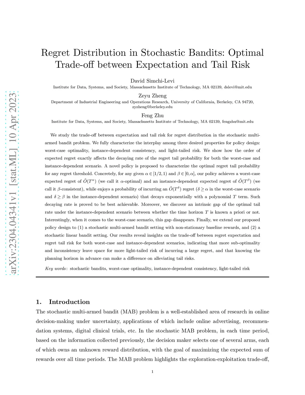 We study the optimal trade-off between expectation and tail risk for regret distribution in the stochastic multi-armed bandit model. We fully characterize the interplay among three desired properties for policy design: worst-case optimality, instance-dependent consistency, and light-tailed risk. New policies are proposed to characterize the optimal regret tail probability for any regret threshold. In particular, we discover an intrinsic gap of the optimal tail rate depending on whether the time horizon is known a priori or not. Interestingly, when it comes to the purely worst-case scenario, this gap disappears. Our results reveal insights on how to design policies that balance between efficiency and safety, and highlight extra insights on policy robustness with regard to policy hyper-parameters and model mis-specification. We also conduct a simulation study to validate our theoretical insights and provide practical amendment to our policies. Finally, we discuss extensions of our results to (i) general sub-exponential environments and (ii) general stochastic linear bandits. Furthermore, we find that a special case of our policy design surprisingly coincides with what was adopted in AlphaGo Monte Carlo Tree Search. Our theory provides high-level insights to why their engineered solution is successful and should be advocated in complex decision-making environments.