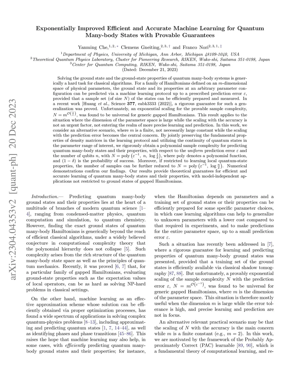 Solving the ground state and the ground-state properties of quantum many-body systems is generically a hard task for classical algorithms. For a family of Hamiltonians defined on an -dimensional space of physical parameters, the ground state and its properties at an arbitrary parameter configuration can be predicted via a machine learning protocol up to a prescribed prediction error , provided that a sample set (of size ) of the states can be efficiently prepared and measured. In a recent work [Huang et al., Science 377, eabk3333 (2022)], a rigorous guarantee for such a generalization was proved. Unfortunately, an exponential scaling for the provable sample complexity, , was found to be universal for generic gapped Hamiltonians. This result applies to the situation where the dimension of the parameter space is large while the scaling with the accuracy is not an urgent factor. In this work, we consider an alternative scenario where is a finite, not necessarily large constant while the scaling with the prediction error becomes the central concern. By jointly preserving the fundamental properties of density matrices in the learning protocol and utilizing the continuity of quantum states in the parameter range of interest, we rigorously obtain a polynomial sample complexity for predicting quantum many-body states and their properties, with respect to the uniform prediction error and the number of qubits . Moreover, if restricted to learning local quantum-state properties, the number of samples with respect to can be further reduced exponentially. Our results provide theoretical guarantees for efficient and accurate learning of quantum many-body states and their properties, with model-independent applications not restricted to ground states of gapped Hamiltonians.
