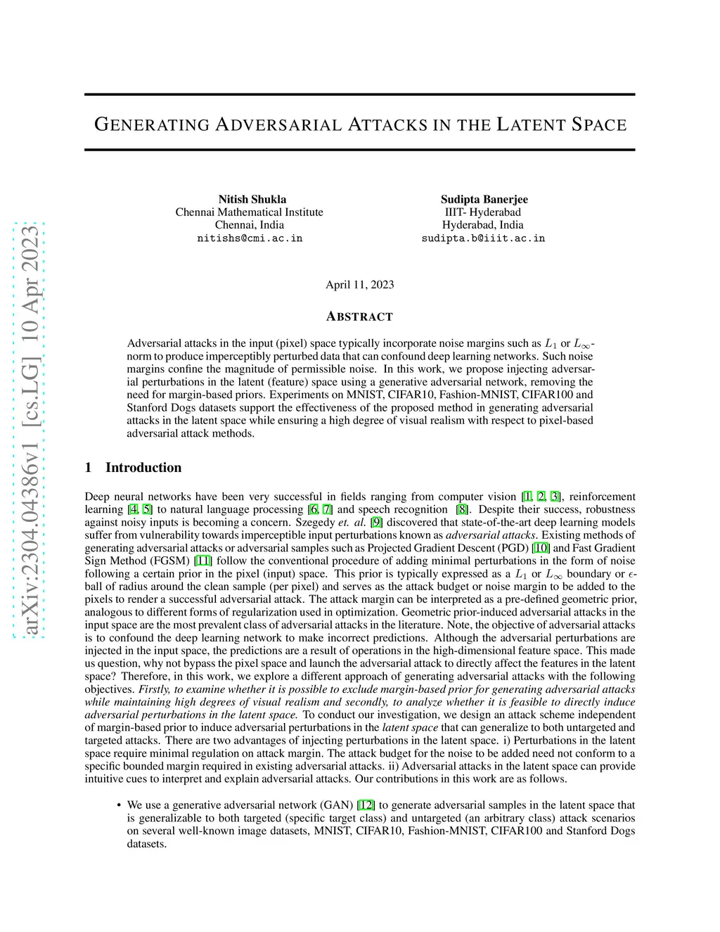 Adversarial attacks in the input (pixel) space typically incorporate noise margins such as or -norm to produce imperceptibly perturbed data that confound deep learning networks. Such noise margins confine the magnitude of permissible noise. In this work, we propose injecting adversarial perturbations in the latent (feature) space using a generative adversarial network, removing the need for margin-based priors. Experiments on MNIST, CIFAR10, Fashion-MNIST, CIFAR100 and Stanford Dogs datasets support the effectiveness of the proposed method in generating adversarial attacks in the latent space while ensuring a high degree of visual realism with respect to pixel-based adversarial attack methods.