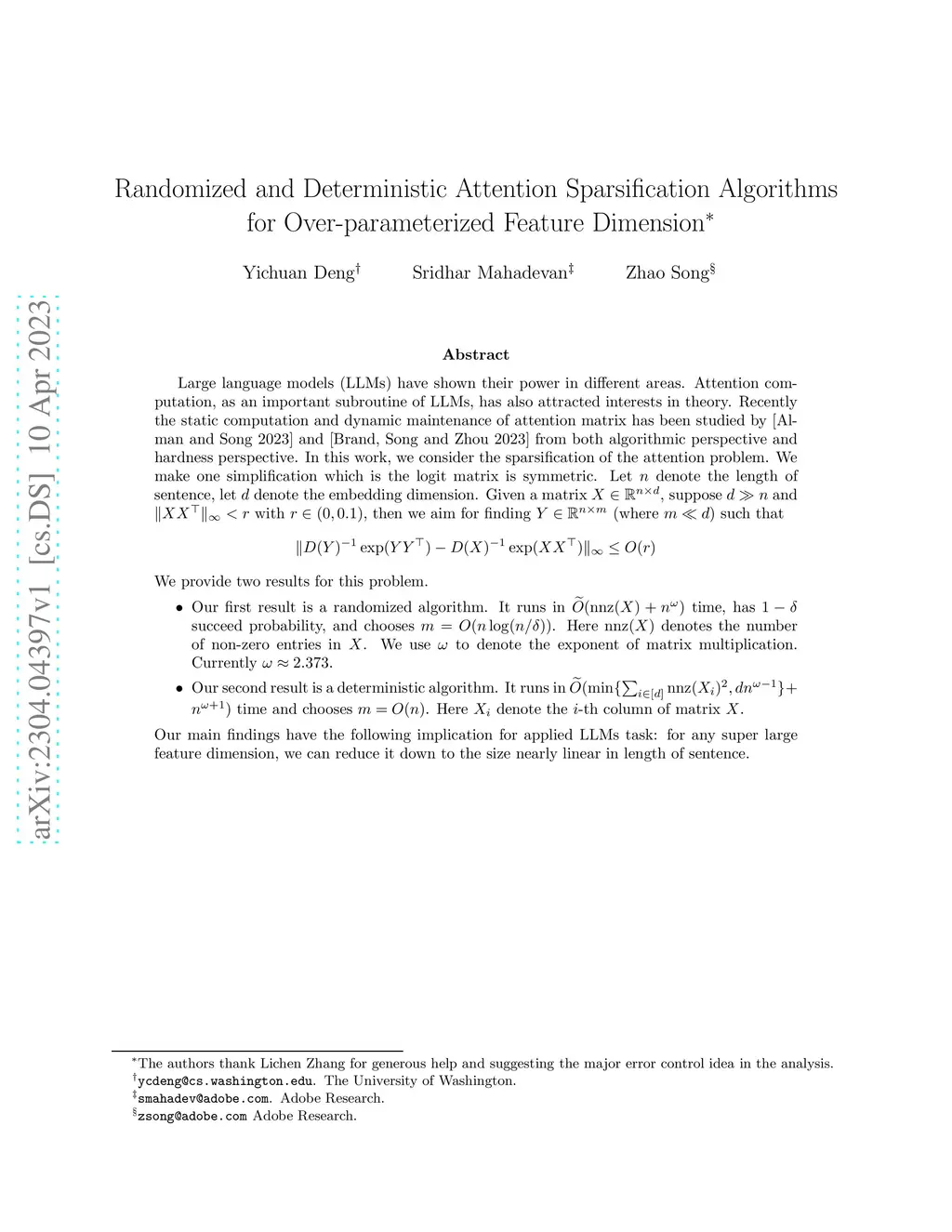 Large language models (LLMs) have shown their power in different areas. Attention computation, as an important subroutine of LLMs, has also attracted interests in theory. Recently the static computation and dynamic maintenance of attention matrix has been studied by [Alman and Song 2023] and [Brand, Song and Zhou 2023] from both algorithmic perspective and hardness perspective. In this work, we consider the sparsification of the attention problem. We make one simplification which is the logit matrix is symmetric. Let denote the length of sentence, let denote the embedding dimension. Given a matrix , suppose and with , then we aim for finding (where ) such that \begin{align*} \| D(Y)^{-1} \exp( Y Y^\top ) - D(X)^{-1} \exp( X X^\top) \|_{\infty} \leq O(r) \end{align*} We provide two results for this problem. Our first result is a randomized algorithm. It runs in $\widetilde{O}(\mathrm{nnz}(X) + n^{\omega} ) $ time, has succeed probability, and chooses . Here denotes the number of non-zero entries in . We use to denote the exponent of matrix multiplication. Currently . Our second result is a deterministic algorithm. It runs in time and chooses . Here denote the -th column of matrix . Our main findings have the following implication for applied LLMs task: for any super large feature dimension, we can reduce it down to the size nearly linear in length of sentence.