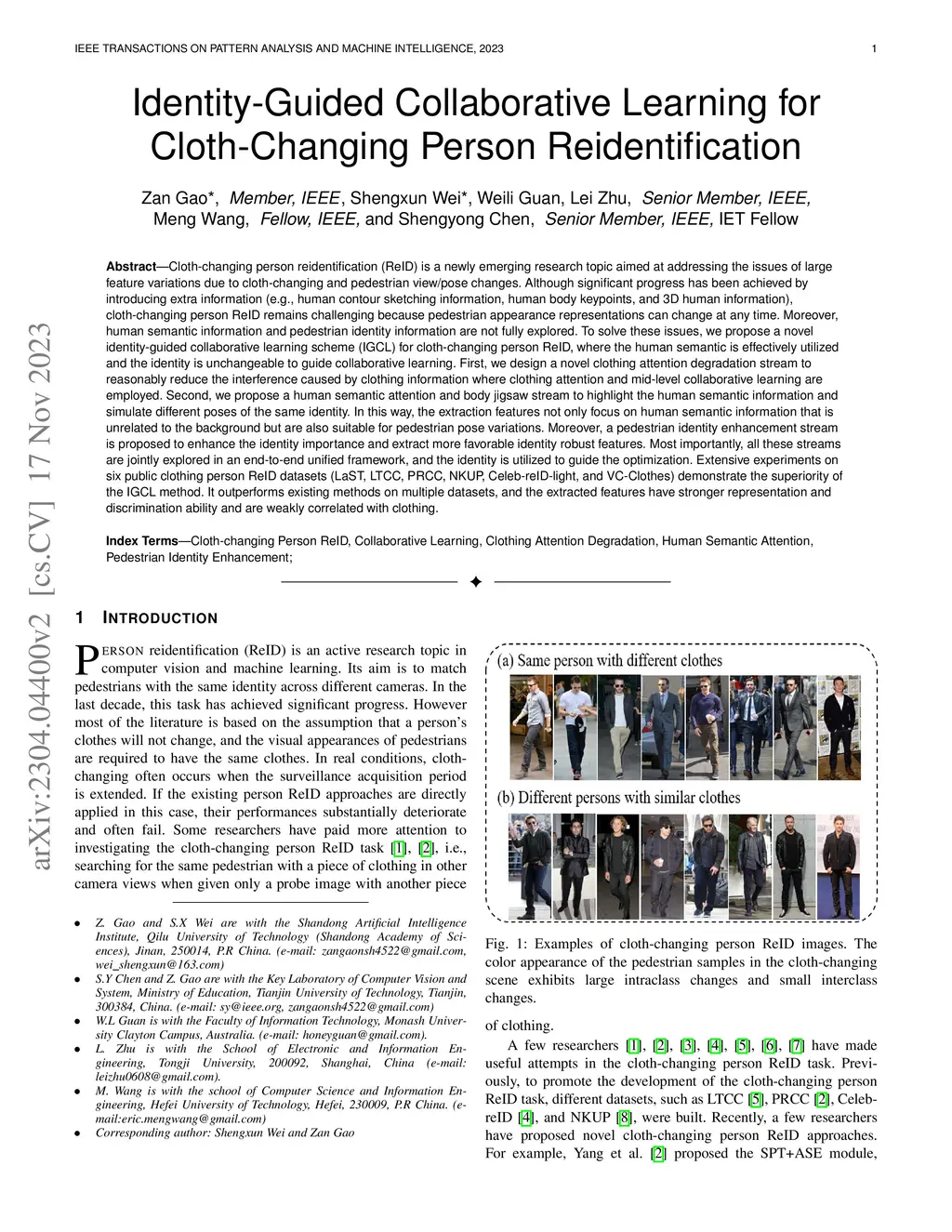 Cloth-changing person reidentification (ReID) is a newly emerging research topic that is aimed at addressing the issues of large feature variations due to cloth-changing and pedestrian view/pose changes. Although significant progress has been achieved by introducing extra information (e.g., human contour sketching information, human body keypoints, and 3D human information), cloth-changing person ReID is still challenging due to impressionable pedestrian representations. Moreover, human semantic information and pedestrian identity information are not fully explored. To solve these issues, we propose a novel identity-guided collaborative learning scheme (IGCL) for cloth-changing person ReID, where the human semantic is fully utilized and the identity is unchangeable to guide collaborative learning. First, we design a novel clothing attention degradation stream to reasonably reduce the interference caused by clothing information where clothing attention and mid-level collaborative learning are employed. Second, we propose a human semantic attention and body jigsaw stream to highlight the human semantic information and simulate different poses of the same identity. In this way, the extraction features not only focus on human semantic information that is unrelated to the background but also are suitable for pedestrian pose variations. Moreover, a pedestrian identity enhancement stream is further proposed to enhance the identity importance and extract more favorable identity robust features. Most importantly, all these streams are jointly explored in an end-to-end unified framework, and the identity is utilized to guide the optimization. Extensive experiments on five public clothing person ReID datasets demonstrate that the proposed IGCL significantly outperforms SOTA methods and that the extracted feature is more robust, discriminative, and clothing-irrelevant.