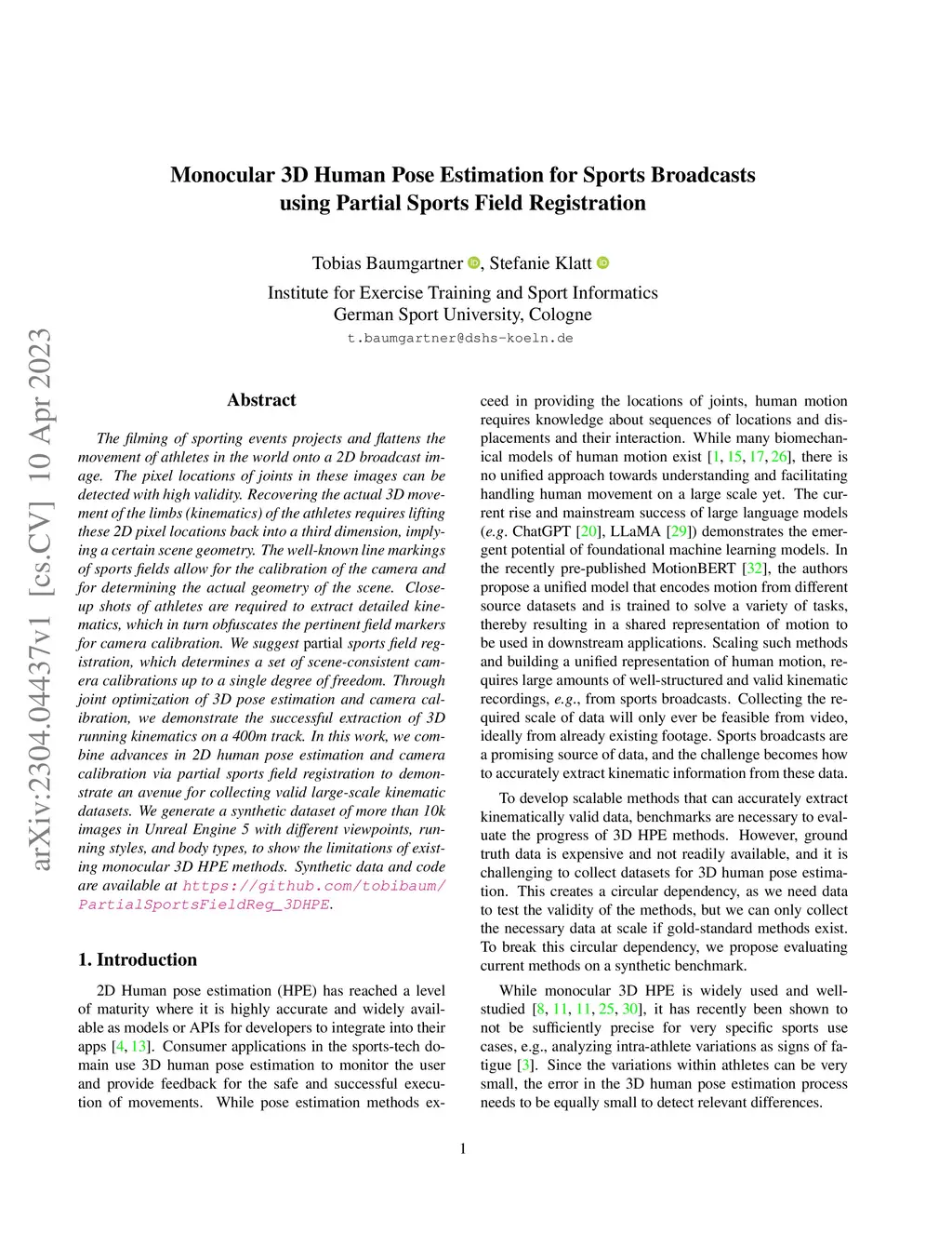 The filming of sporting events projects and flattens the movement of athletes in the world onto a 2D broadcast image. The pixel locations of joints in these images can be detected with high validity. Recovering the actual 3D movement of the limbs (kinematics) of the athletes requires lifting these 2D pixel locations back into a third dimension, implying a certain scene geometry. The well-known line markings of sports fields allow for the calibration of the camera and for determining the actual geometry of the scene. Close-up shots of athletes are required to extract detailed kinematics, which in turn obfuscates the pertinent field markers for camera calibration. We suggest partial sports field registration, which determines a set of scene-consistent camera calibrations up to a single degree of freedom. Through joint optimization of 3D pose estimation and camera calibration, we demonstrate the successful extraction of 3D running kinematics on a 400m track. In this work, we combine advances in 2D human pose estimation and camera calibration via partial sports field registration to demonstrate an avenue for collecting valid large-scale kinematic datasets. We generate a synthetic dataset of more than 10k images in Unreal Engine 5 with different viewpoints, running styles, and body types, to show the limitations of existing monocular 3D HPE methods. Synthetic data and code are available at https://github.com/tobibaum/PartialSportsFieldReg_3DHPE.