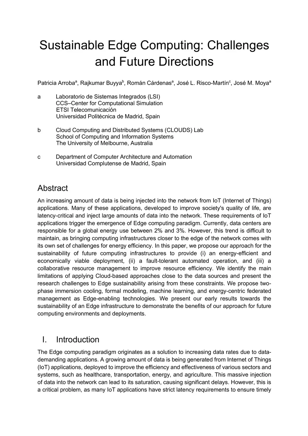 An increasing amount of data is being injected into the network from IoT (Internet of Things) applications. Many of these applications, developed to improve society's quality of life, are latency-critical and inject large amounts of data into the network. These requirements of IoT applications trigger the emergence of Edge computing paradigm. Currently, data centers are responsible for a global energy use between 2% and 3%. However, this trend is difficult to maintain, as bringing computing infrastructures closer to the edge of the network comes with its own set of challenges for energy efficiency. In this paper, we propose our approach for the sustainability of future computing infrastructures to provide (i) an energy-efficient and economically viable deployment, (ii) a fault-tolerant automated operation, and (iii) a collaborative resource management to improve resource efficiency. We identify the main limitations of applying Cloud-based approaches close to the data sources and present the research challenges to Edge sustainability arising from these constraints. We propose two-phase immersion cooling, formal modeling, machine learning, and energy-centric federated management as Edge-enabling technologies. We present our early results towards the sustainability of an Edge infrastructure to demonstrate the benefits of our approach for future computing environments and deployments.