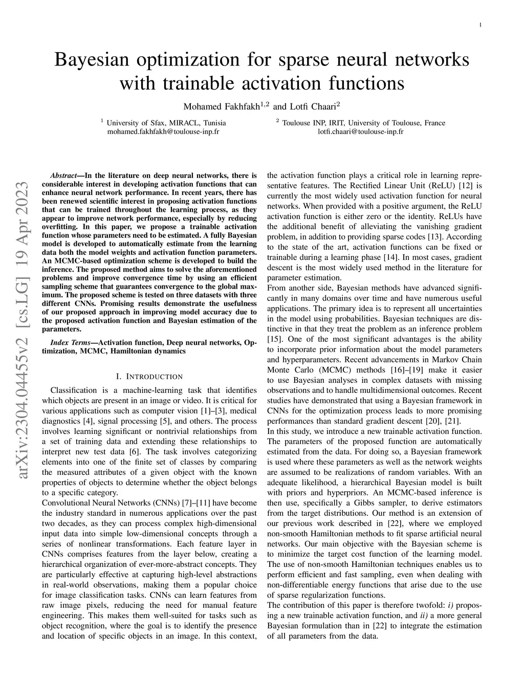 In the literature on deep neural networks, there is considerable interest in developing activation functions that can enhance neural network performance. In recent years, there has been renewed scientific interest in proposing activation functions that can be trained throughout the learning process, as they appear to improve network performance, especially by reducing overfitting. In this paper, we propose a trainable activation function whose parameters need to be estimated. A fully Bayesian model is developed to automatically estimate from the learning data both the model weights and activation function parameters. An MCMC-based optimization scheme is developed to build the inference. The proposed method aims to solve the aforementioned problems and improve convergence time by using an efficient sampling scheme that guarantees convergence to the global maximum. The proposed scheme is tested on three datasets with three different CNNs. Promising results demonstrate the usefulness of our proposed approach in improving model accuracy due to the proposed activation function and Bayesian estimation of the parameters.
