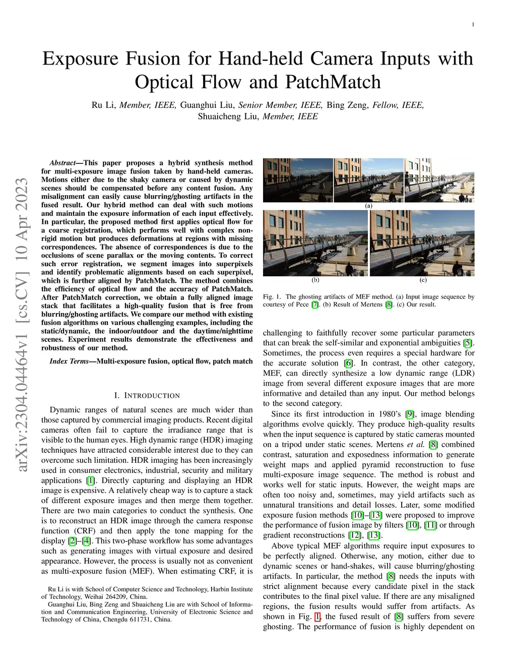 This paper proposes a hybrid synthesis method for multi-exposure image fusion taken by hand-held cameras. Motions either due to the shaky camera or caused by dynamic scenes should be compensated before any content fusion. Any misalignment can easily cause blurring/ghosting artifacts in the fused result. Our hybrid method can deal with such motions and maintain the exposure information of each input effectively. In particular, the proposed method first applies optical flow for a coarse registration, which performs well with complex non-rigid motion but produces deformations at regions with missing correspondences. The absence of correspondences is due to the occlusions of scene parallax or the moving contents. To correct such error registration, we segment images into superpixels and identify problematic alignments based on each superpixel, which is further aligned by PatchMatch. The method combines the efficiency of optical flow and the accuracy of PatchMatch. After PatchMatch correction, we obtain a fully aligned image stack that facilitates a high-quality fusion that is free from blurring/ghosting artifacts. We compare our method with existing fusion algorithms on various challenging examples, including the static/dynamic, the indoor/outdoor and the daytime/nighttime scenes. Experiment results demonstrate the effectiveness and robustness of our method.
