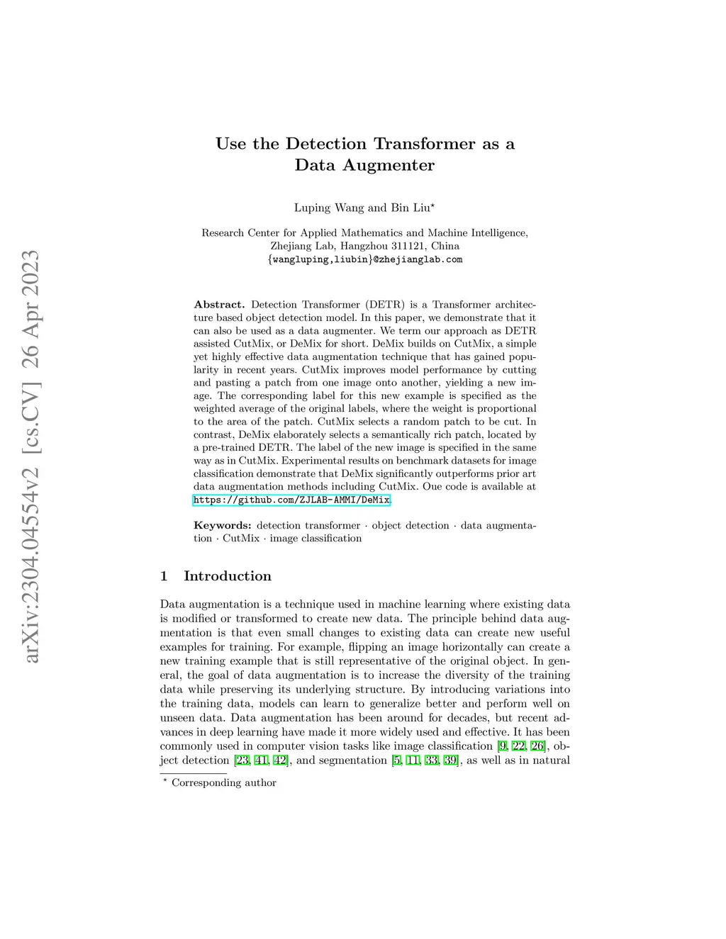 Detection Transformer (DETR) is a Transformer architecture based object detection model. In this paper, we demonstrate that it can also be used as a data augmenter. We term our approach as DETR assisted CutMix, or DeMix for short. DeMix builds on CutMix, a simple yet highly effective data augmentation technique that has gained popularity in recent years. CutMix improves model performance by cutting and pasting a patch from one image onto another, yielding a new image. The corresponding label for this new example is specified as the weighted average of the original labels, where the weight is proportional to the area of the patch. CutMix selects a random patch to be cut. In contrast, DeMix elaborately selects a semantically rich patch, located by a pre-trained DETR. The label of the new image is specified in the same way as in CutMix. Experimental results on benchmark datasets for image classification demonstrate that DeMix significantly outperforms prior art data augmentation methods including CutMix. Oue code is available at https://github.com/ZJLAB-AMMI/DeMix.