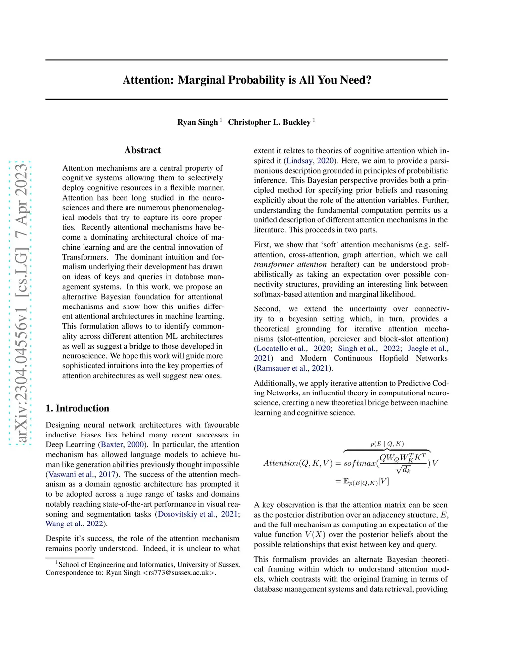 Attention mechanisms are a central property of cognitive systems allowing them to selectively deploy cognitive resources in a flexible manner. Attention has been long studied in the neurosciences and there are numerous phenomenological models that try to capture its core properties. Recently attentional mechanisms have become a dominating architectural choice of machine learning and are the central innovation of Transformers. The dominant intuition and formalism underlying their development has drawn on ideas of keys and queries in database management systems. In this work, we propose an alternative Bayesian foundation for attentional mechanisms and show how this unifies different attentional architectures in machine learning. This formulation allows to to identify commonality across different attention ML architectures as well as suggest a bridge to those developed in neuroscience. We hope this work will guide more sophisticated intuitions into the key properties of attention architectures and suggest new ones.