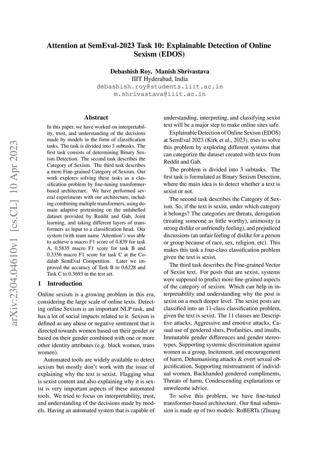 In this paper, we have worked on interpretability, trust, and understanding of the decisions made by models in the form of classification tasks. The task is divided into 3 subtasks. The first task consists of determining Binary Sexism Detection. The second task describes the Category of Sexism. The third task describes a more Fine-grained Category of Sexism. Our work explores solving these tasks as a classification problem by fine-tuning transformer-based architecture. We have performed several experiments with our architecture, including combining multiple transformers, using domain adaptive pretraining on the unlabelled dataset provided by Reddit and Gab, Joint learning, and taking different layers of transformers as input to a classification head. Our system (with team name Attention) was able to achieve a macro F1 score of 0.839 for task A, 0.5835 macro F1 score for task B and 0.3356 macro F1 score for task C at the Codalab SemEval Competition. Later we improved the accuracy of Task B to 0.6228 and Task C to 0.3693 in the test set.