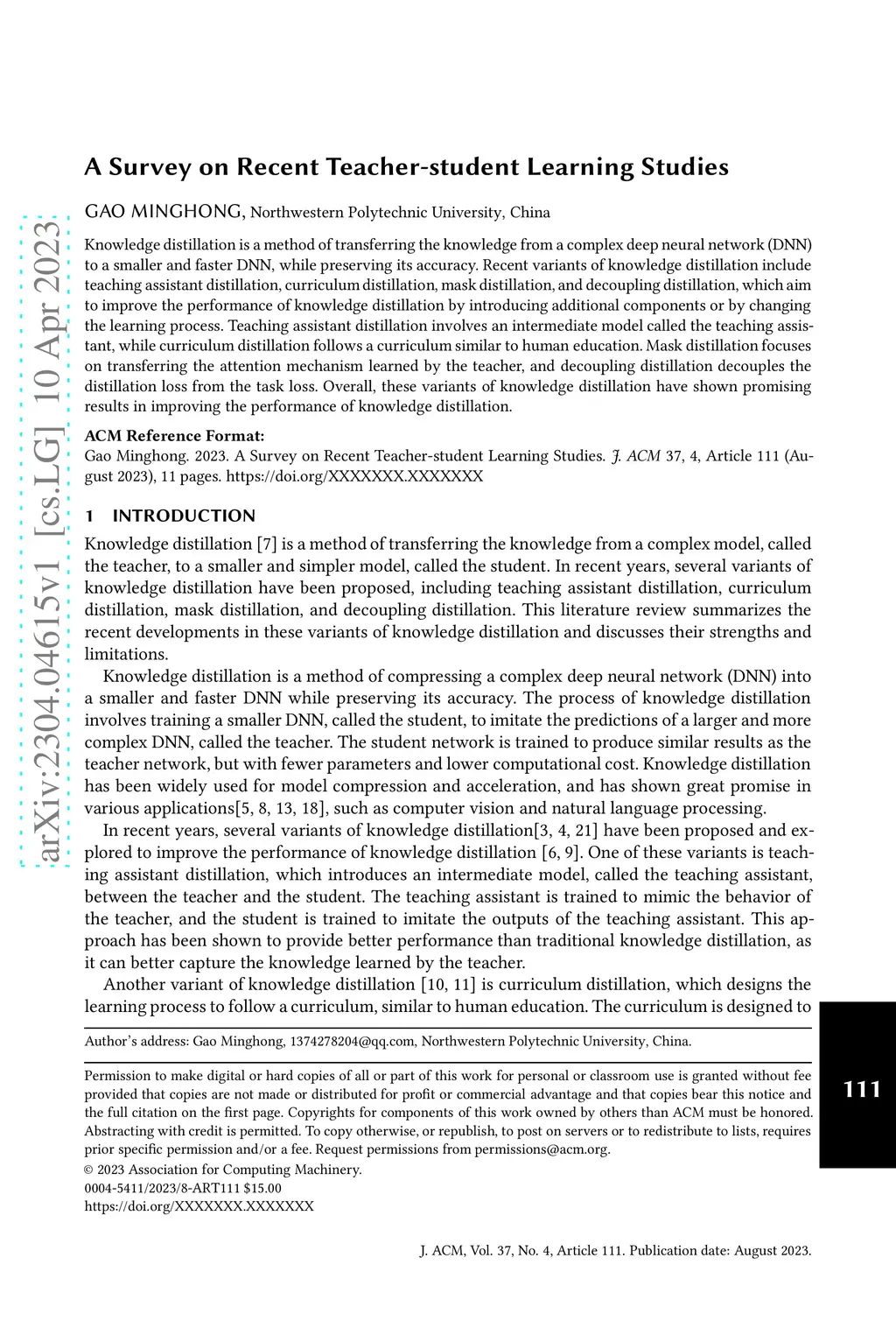 Knowledge distillation is a method of transferring the knowledge from a complex deep neural network (DNN) to a smaller and faster DNN, while preserving its accuracy. Recent variants of knowledge distillation include teaching assistant distillation, curriculum distillation, mask distillation, and decoupling distillation, which aim to improve the performance of knowledge distillation by introducing additional components or by changing the learning process. Teaching assistant distillation involves an intermediate model called the teaching assistant, while curriculum distillation follows a curriculum similar to human education. Mask distillation focuses on transferring the attention mechanism learned by the teacher, and decoupling distillation decouples the distillation loss from the task loss. Overall, these variants of knowledge distillation have shown promising results in improving the performance of knowledge distillation.