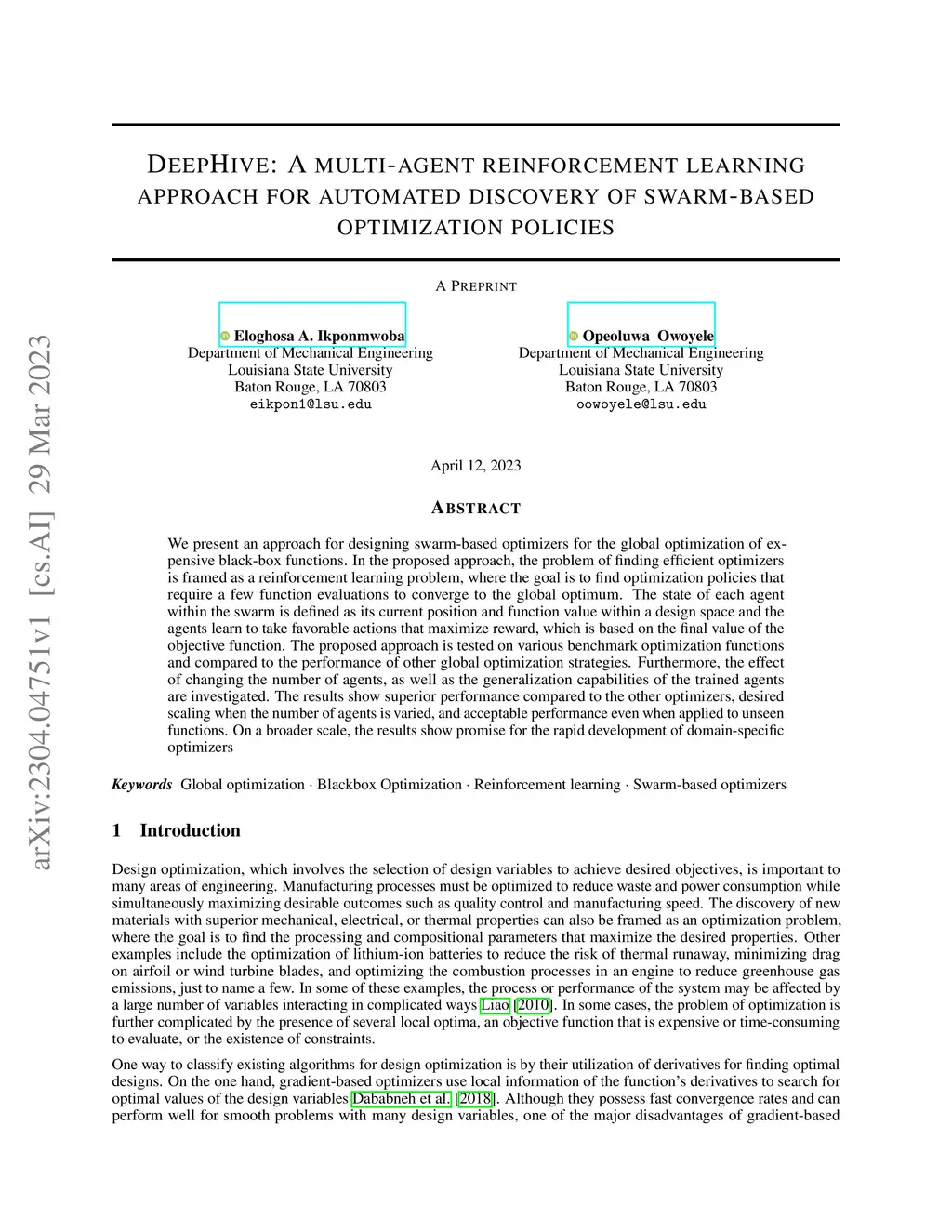 We present an approach for designing swarm-based optimizers for the global optimization of expensive black-box functions. In the proposed approach, the problem of finding efficient optimizers is framed as a reinforcement learning problem, where the goal is to find optimization policies that require a few function evaluations to converge to the global optimum. The state of each agent within the swarm is defined as its current position and function value within a design space and the agents learn to take favorable actions that maximize reward, which is based on the final value of the objective function. The proposed approach is tested on various benchmark optimization functions and compared to the performance of other global optimization strategies. Furthermore, the effect of changing the number of agents, as well as the generalization capabilities of the trained agents are investigated. The results show superior performance compared to the other optimizers, desired scaling when the number of agents is varied, and acceptable performance even when applied to unseen functions. On a broader scale, the results show promise for the rapid development of domain-specific optimizers.