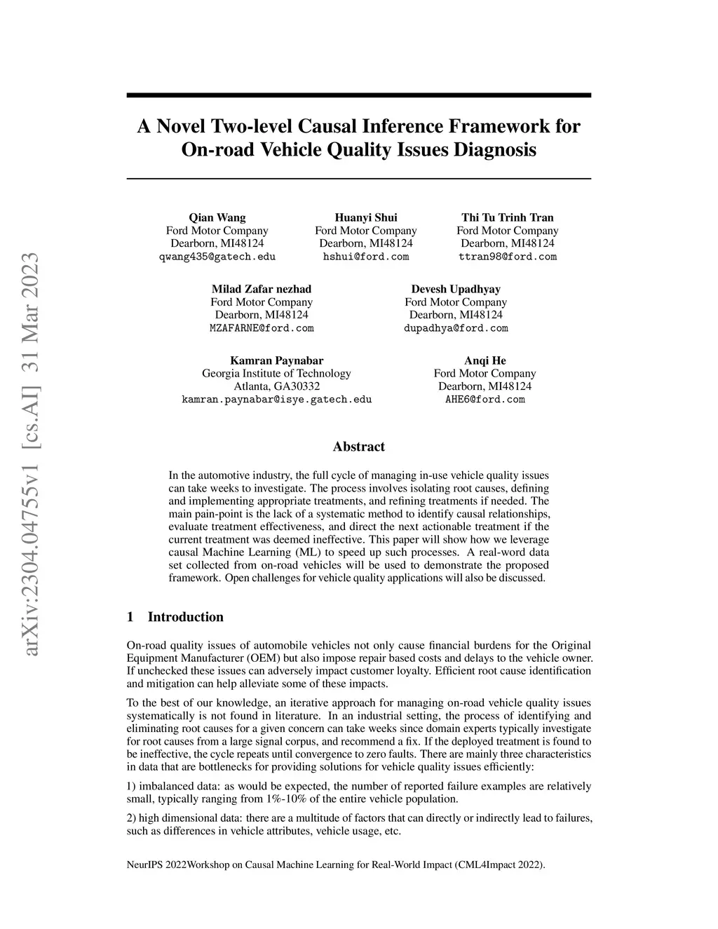 In the automotive industry, the full cycle of managing in-use vehicle quality issues can take weeks to investigate. The process involves isolating root causes, defining and implementing appropriate treatments, and refining treatments if needed. The main pain-point is the lack of a systematic method to identify causal relationships, evaluate treatment effectiveness, and direct the next actionable treatment if the current treatment was deemed ineffective. This paper will show how we leverage causal Machine Learning (ML) to speed up such processes. A real-word data set collected from on-road vehicles will be used to demonstrate the proposed framework. Open challenges for vehicle quality applications will also be discussed.
