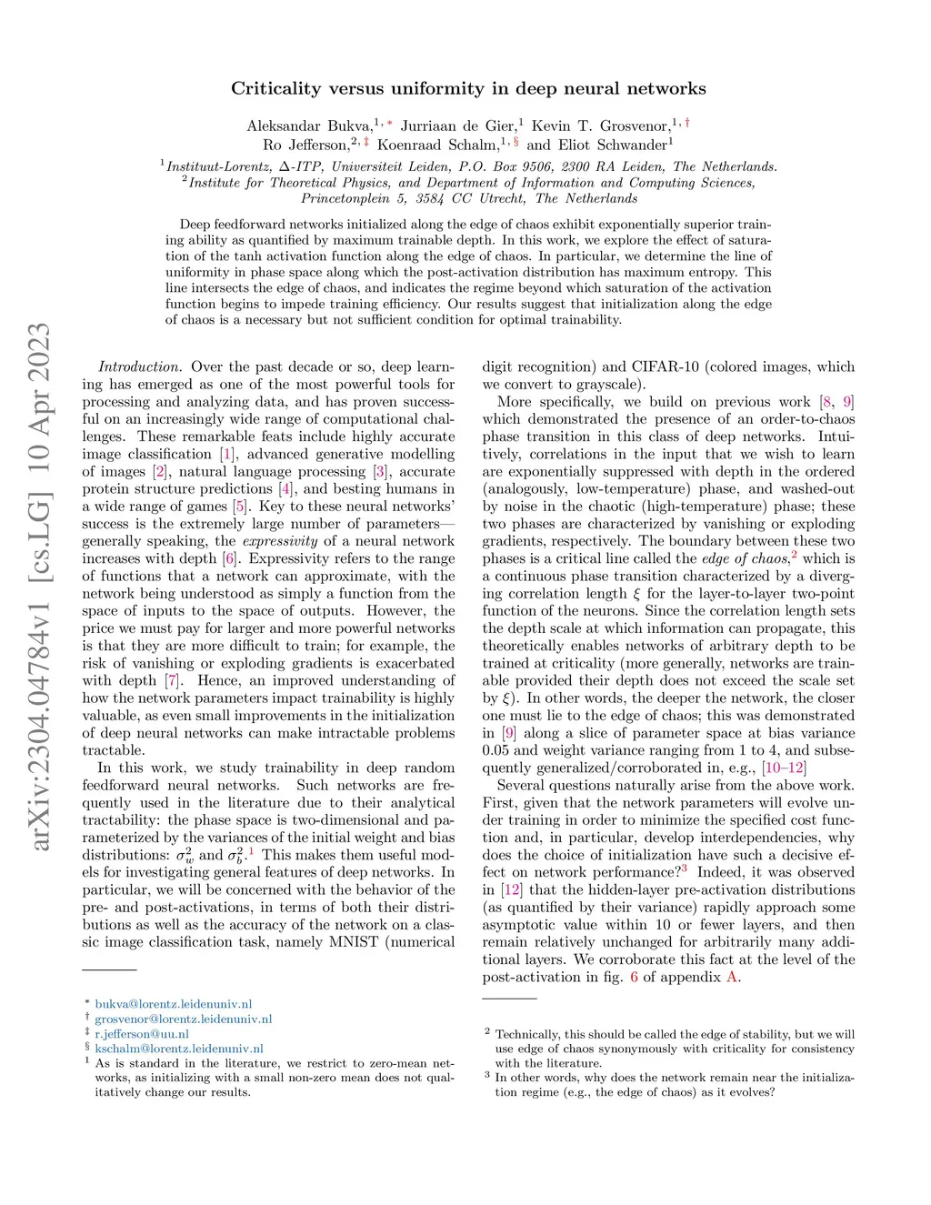 Deep feedforward networks initialized along the edge of chaos exhibit exponentially superior training ability as quantified by maximum trainable depth. In this work, we explore the effect of saturation of the tanh activation function along the edge of chaos. In particular, we determine the line of uniformity in phase space along which the post-activation distribution has maximum entropy. This line intersects the edge of chaos, and indicates the regime beyond which saturation of the activation function begins to impede training efficiency. Our results suggest that initialization along the edge of chaos is a necessary but not sufficient condition for optimal trainability.