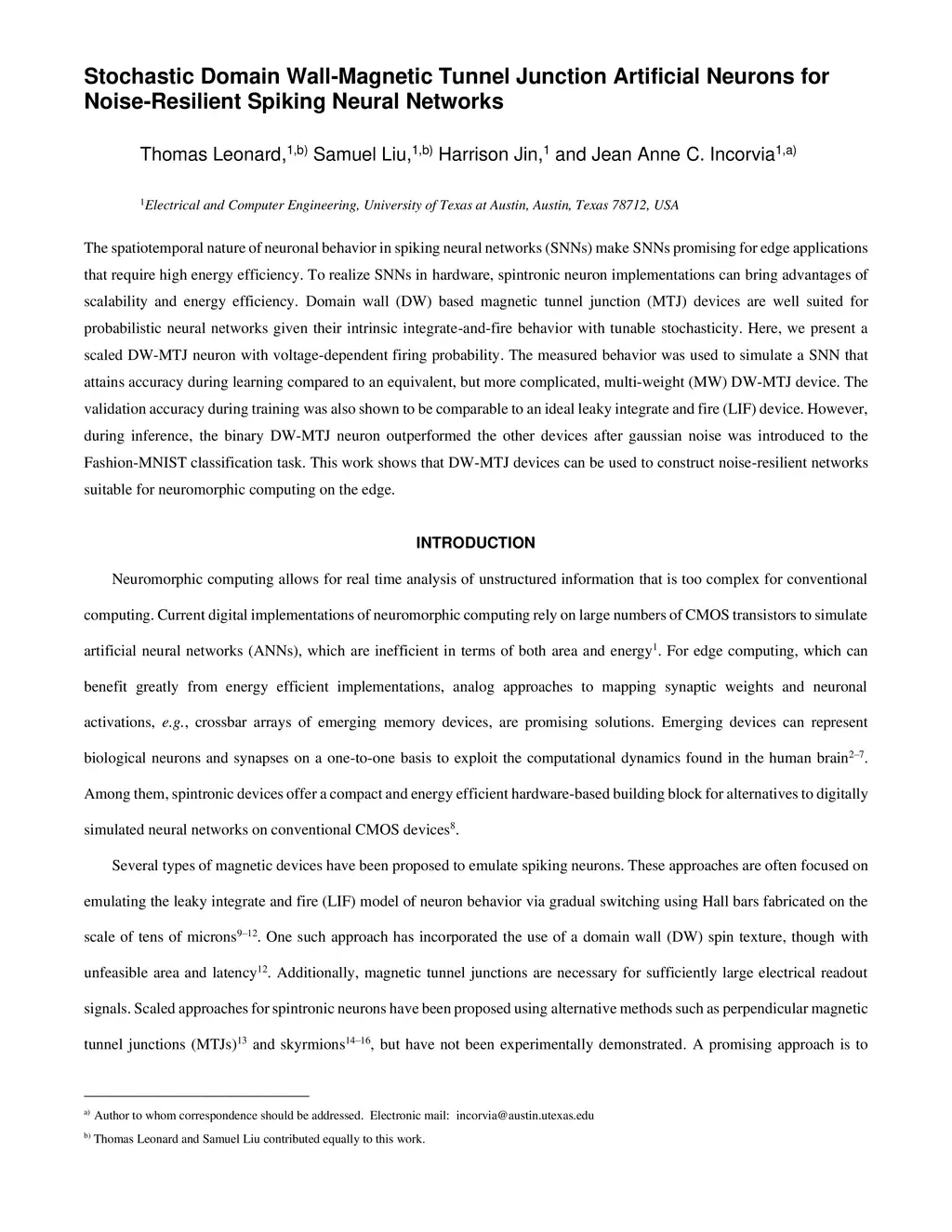 The spatiotemporal nature of neuronal behavior in spiking neural networks (SNNs) make SNNs promising for edge applications that require high energy efficiency. To realize SNNs in hardware, spintronic neuron implementations can bring advantages of scalability and energy efficiency. Domain wall (DW) based magnetic tunnel junction (MTJ) devices are well suited for probabilistic neural networks given their intrinsic integrate-and-fire behavior with tunable stochasticity. Here, we present a scaled DW-MTJ neuron with voltage-dependent firing probability. The measured behavior was used to simulate a SNN that attains accuracy during learning compared to an equivalent, but more complicated, multi-weight (MW) DW-MTJ device. The validation accuracy during training was also shown to be comparable to an ideal leaky integrate and fire (LIF) device. However, during inference, the binary DW-MTJ neuron outperformed the other devices after gaussian noise was introduced to the Fashion-MNIST classification task. This work shows that DW-MTJ devices can be used to construct noise-resilient networks suitable for neuromorphic computing on the edge.