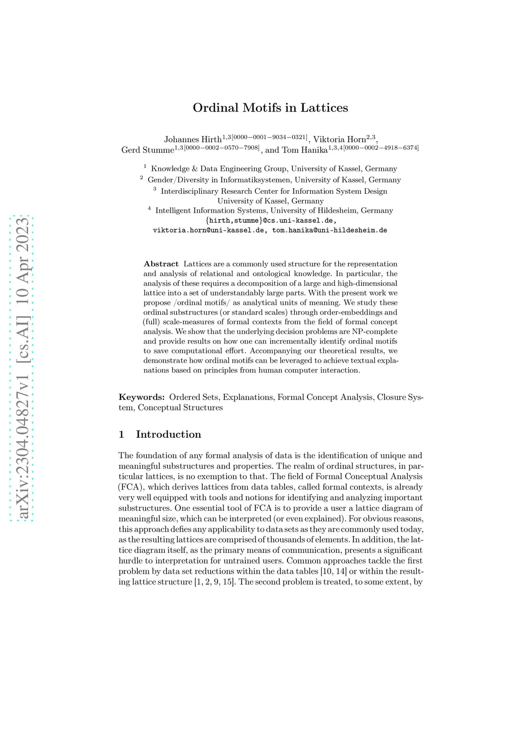 Lattices are a commonly used structure for the representation and analysis of relational and ontological knowledge. In particular, the analysis of these requires a decomposition of a large and high-dimensional lattice into a set of understandably large parts. With the present work we propose /ordinal motifs/ as analytical units of meaning. We study these ordinal substructures (or standard scales) through (full) scale-measures of formal contexts from the field of formal concept analysis. We show that the underlying decision problems are NP-complete and provide results on how one can incrementally identify ordinal motifs to save computational effort. Accompanying our theoretical results, we demonstrate how ordinal motifs can be leveraged to retrieve basic meaning from a medium sized ordinal data set.
