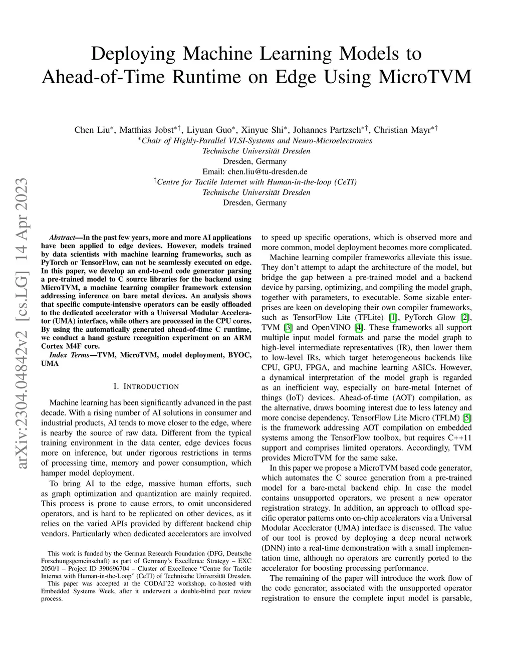 In the past few years, more and more AI applications have been applied to edge devices. However, models trained by data scientists with machine learning frameworks, such as PyTorch or TensorFlow, can not be seamlessly executed on edge. In this paper, we develop an end-to-end code generator parsing a pre-trained model to C source libraries for the backend using MicroTVM, a machine learning compiler framework extension addressing inference on bare metal devices. An analysis shows that specific compute-intensive operators can be easily offloaded to the dedicated accelerator with a Universal Modular Accelerator (UMA) interface, while others are processed in the CPU cores. By using the automatically generated ahead-of-time C runtime, we conduct a hand gesture recognition experiment on an ARM Cortex M4F core.