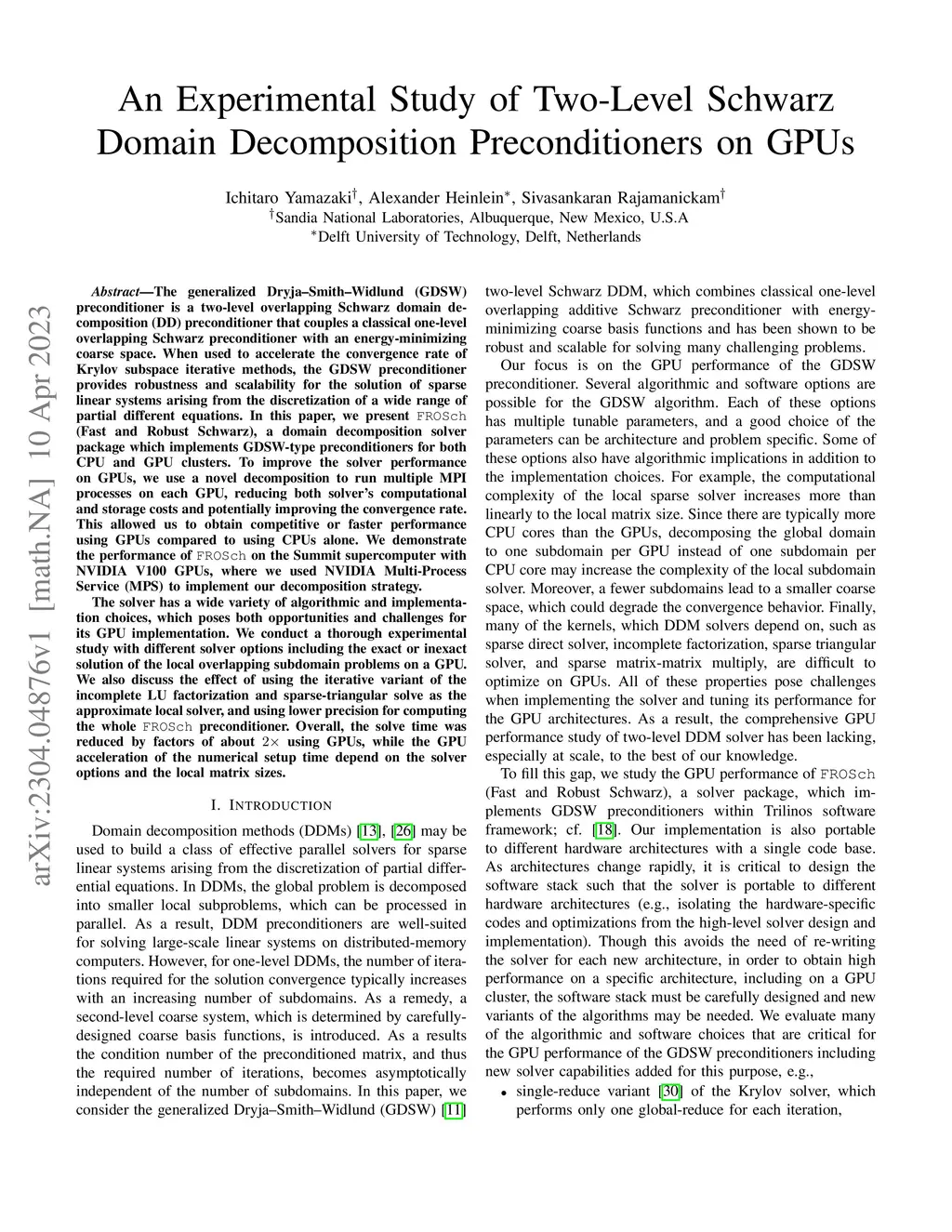 The generalized Dryja--Smith--Widlund (GDSW) preconditioner is a two-level overlapping Schwarz domain decomposition (DD) preconditioner that couples a classical one-level overlapping Schwarz preconditioner with an energy-minimizing coarse space. When used to accelerate the convergence rate of Krylov subspace iterative methods, the GDSW preconditioner provides robustness and scalability for the solution of sparse linear systems arising from the discretization of a wide range of partial different equations. In this paper, we present FROSch (Fast and Robust Schwarz), a domain decomposition solver package which implements GDSW-type preconditioners for both CPU and GPU clusters. To improve the solver performance on GPUs, we use a novel decomposition to run multiple MPI processes on each GPU, reducing both solver's computational and storage costs and potentially improving the convergence rate. This allowed us to obtain competitive or faster performance using GPUs compared to using CPUs alone. We demonstrate the performance of FROSch on the Summit supercomputer with NVIDIA V100 GPUs, where we used NVIDIA Multi-Process Service (MPS) to implement our decomposition strategy. The solver has a wide variety of algorithmic and implementation choices, which poses both opportunities and challenges for its GPU implementation. We conduct a thorough experimental study with different solver options including the exact or inexact solution of the local overlapping subdomain problems on a GPU. We also discuss the effect of using the iterative variant of the incomplete LU factorization and sparse-triangular solve as the approximate local solver, and using lower precision for computing the whole FROSch preconditioner. Overall, the solve time was reduced by factors of about using GPUs, while the GPU acceleration of the numerical setup time depend on the solver options and the local matrix sizes.