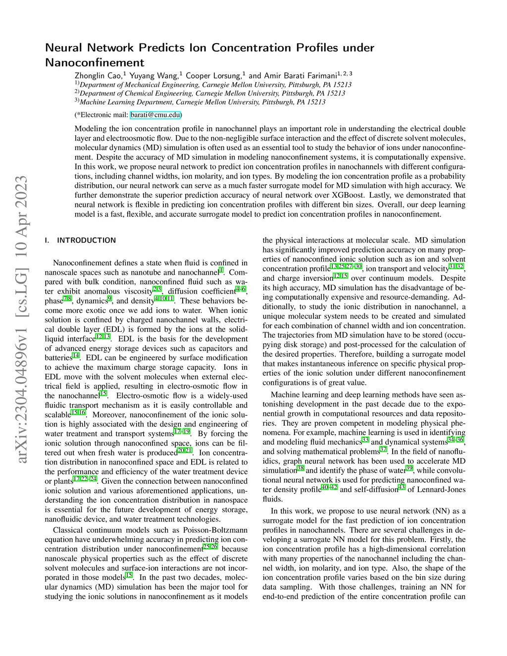 Modeling the ion concentration profile in nanochannel plays an important role in understanding the electrical double layer and electroosmotic flow. Due to the non-negligible surface interaction and the effect of discrete solvent molecules, molecular dynamics (MD) simulation is often used as an essential tool to study the behavior of ions under nanoconfinement. Despite the accuracy of MD simulation in modeling nanoconfinement systems, it is computationally expensive. In this work, we propose neural network to predict ion concentration profiles in nanochannels with different configurations, including channel widths, ion molarity, and ion types. By modeling the ion concentration profile as a probability distribution, our neural network can serve as a much faster surrogate model for MD simulation with high accuracy. We further demonstrate the superior prediction accuracy of neural network over XGBoost. Lastly, we demonstrated that neural network is flexible in predicting ion concentration profiles with different bin sizes. Overall, our deep learning model is a fast, flexible, and accurate surrogate model to predict ion concentration profiles in nanoconfinement.
