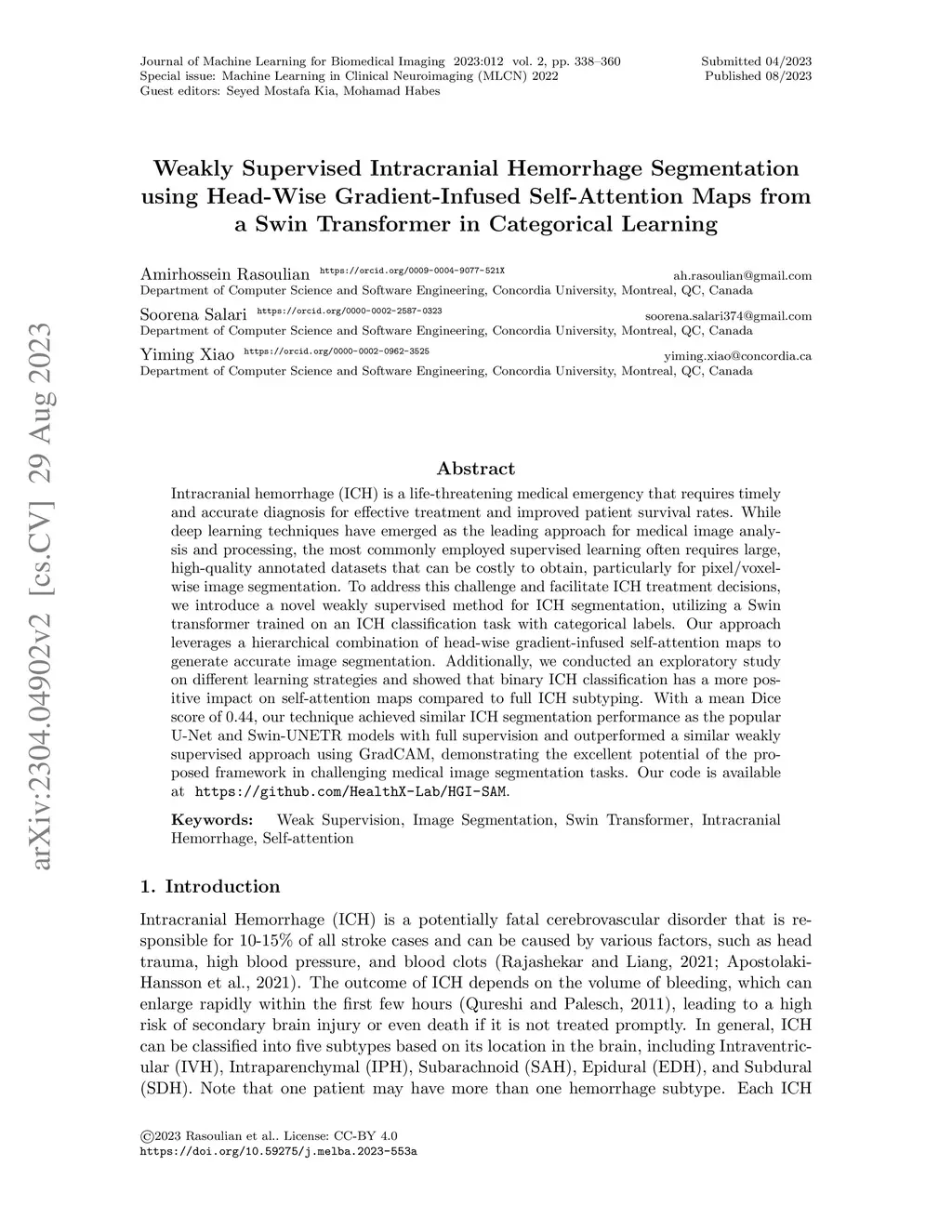 Intracranial hemorrhage (ICH) is a life-threatening medical emergency that requires timely and accurate diagnosis for effective treatment and improved patient survival rates. While deep learning techniques have emerged as the leading approach for medical image analysis and processing, the most commonly employed supervised learning often requires large, high-quality annotated datasets that can be costly to obtain, particularly for pixel/voxel-wise image segmentation. To address this challenge and facilitate ICH treatment decisions, we introduce a novel weakly supervised method for ICH segmentation, utilizing a Swin transformer trained on an ICH classification task with categorical labels. Our approach leverages a hierarchical combination of head-wise gradient-infused self-attention maps to generate accurate image segmentation. Additionally, we conducted an exploratory study on different learning strategies and showed that binary ICH classification has a more positive impact on self-attention maps compared to full ICH subtyping. With a mean Dice score of 0.44, our technique achieved similar ICH segmentation performance as the popular U-Net and Swin-UNETR models with full supervision and outperformed a similar weakly supervised approach using GradCAM, demonstrating the excellent potential of the proposed framework in challenging medical image segmentation tasks. Our code is available at https://github.com/HealthX-Lab/HGI-SAM.