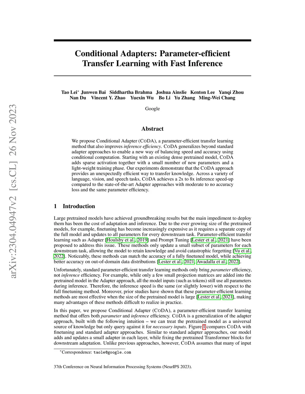 We propose Conditional Adapter (CoDA), a parameter-efficient transfer learning method that also improves inference efficiency. CoDA generalizes beyond standard adapter approaches to enable a new way of balancing speed and accuracy using conditional computation. Starting with an existing dense pretrained model, CoDA adds sparse activation together with a small number of new parameters and a light-weight training phase. Our experiments demonstrate that the CoDA approach provides an unexpectedly efficient way to transfer knowledge. Across a variety of language, vision, and speech tasks, CoDA achieves a 2x to 8x inference speed-up compared to the state-of-the-art Adapter approaches with moderate to no accuracy loss and the same parameter efficiency.