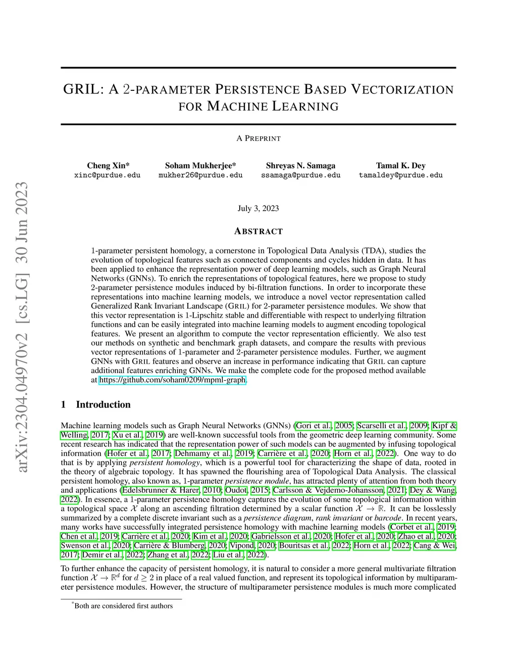 -parameter persistent homology, a cornerstone in Topological Data Analysis (TDA), studies the evolution of topological features such as connected components and cycles hidden in data. It has been applied to enhance the representation power of deep learning models, such as Graph Neural Networks (GNNs). To enrich the representations of topological features, here we propose to study -parameter persistence modules induced by bi-filtration functions. In order to incorporate these representations into machine learning models, we introduce a novel vector representation called Generalized Rank Invariant Landscape (GRIL) for -parameter persistence modules. We show that this vector representation is -Lipschitz stable and differentiable with respect to underlying filtration functions and can be easily integrated into machine learning models to augment encoding topological features. We present an algorithm to compute the vector representation efficiently. We also test our methods on synthetic and benchmark graph datasets, and compare the results with previous vector representations of -parameter and -parameter persistence modules. Further, we augment GNNs with GRIL features and observe an increase in performance indicating that GRIL can capture additional features enriching GNNs. We make the complete code for the proposed method available at https://github.com/soham0209/mpml-graph.