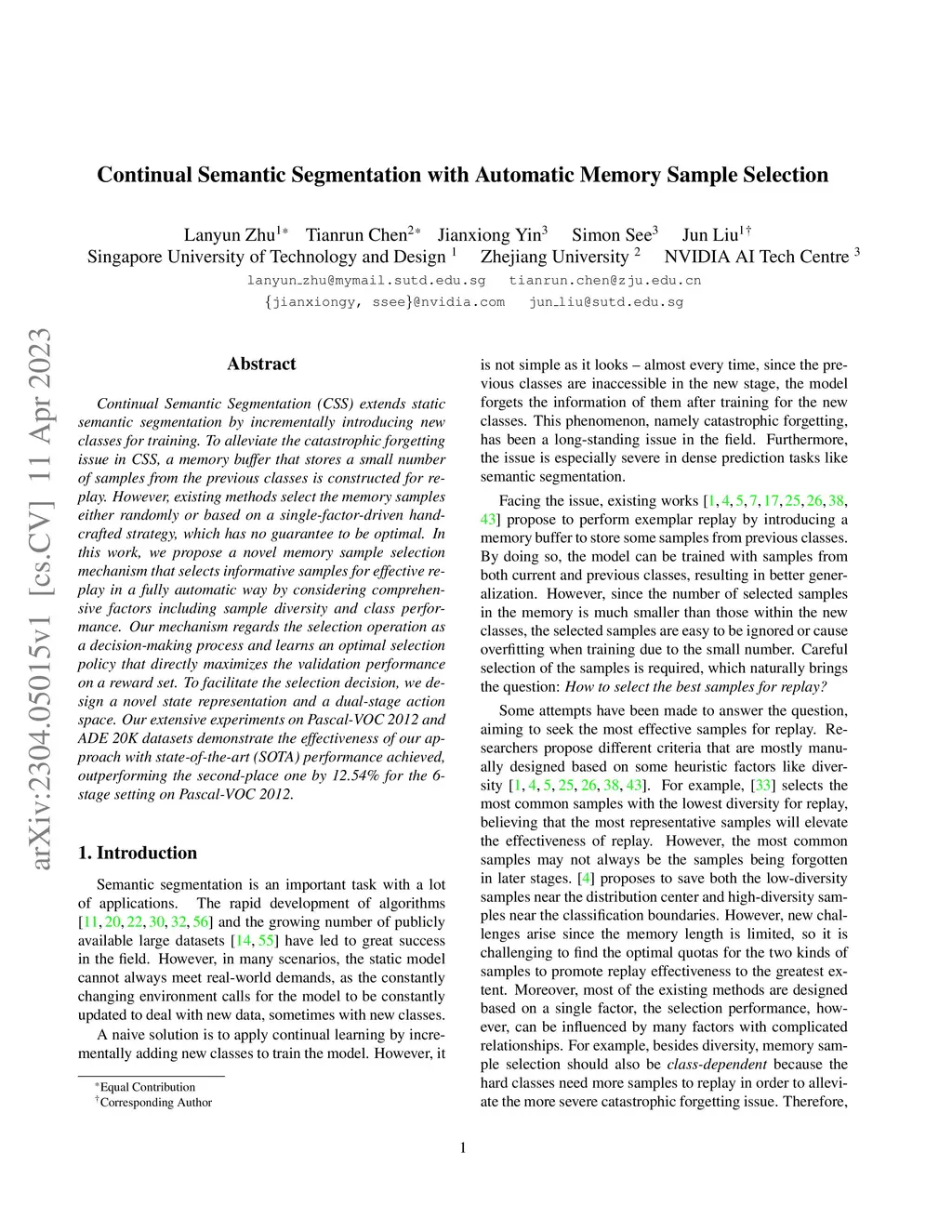 Continual Semantic Segmentation with Automatic Memory Sample Selection