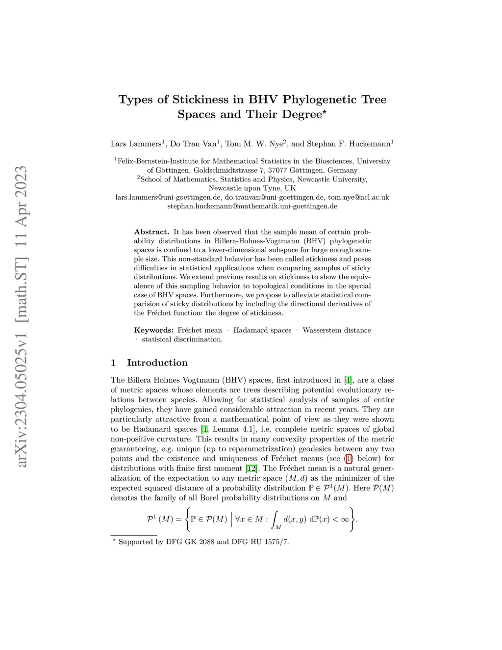 It has been observed that the sample mean of certain probability distributions in Billera-Holmes-Vogtmann (BHV) phylogenetic spaces is confined to a lower-dimensional subspace for large enough sample size. This non-standard behavior has been called stickiness and poses difficulties in statistical applications when comparing samples of sticky distributions. We extend previous results on stickiness to show the equivalence of this sampling behavior to topological conditions in the special case of BHV spaces. Furthermore, we propose to alleviate statistical comparision of sticky distributions by including the directional derivatives of the Fr\échet function: the degree of stickiness.