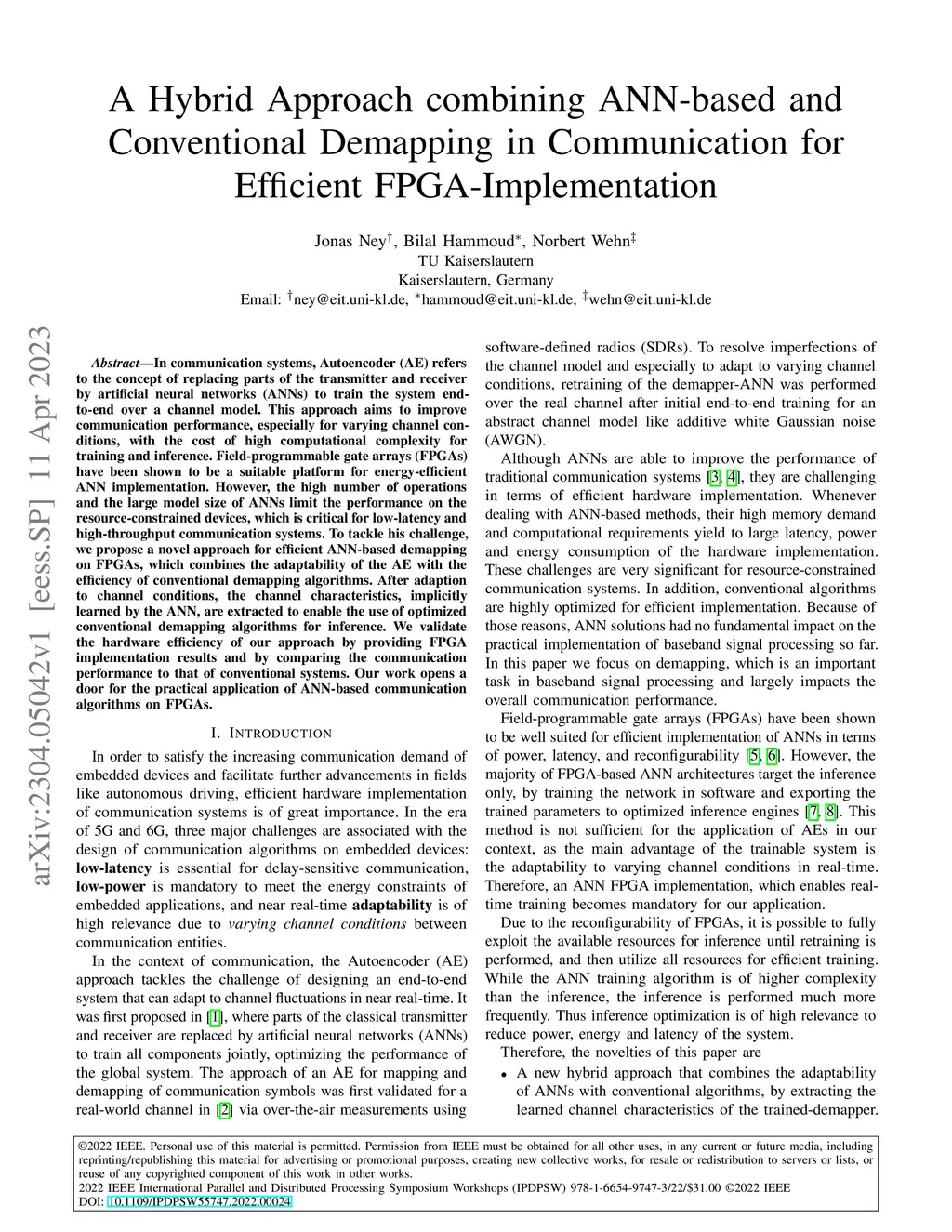 In communication systems, Autoencoder (AE) refers to the concept of replacing parts of the transmitter and receiver by artificial neural networks (ANNs) to train the system end-to-end over a channel model. This approach aims to improve communication performance, especially for varying channel conditions, with the cost of high computational complexity for training and inference. Field-programmable gate arrays (FPGAs) have been shown to be a suitable platform for energy-efficient ANN implementation. However, the high number of operations and the large model size of ANNs limit the performance on resource-constrained devices, which is critical for low latency and high-throughput communication systems. To tackle his challenge, we propose a novel approach for efficient ANN-based remapping on FPGAs, which combines the adaptability of the AE with the efficiency of conventional demapping algorithms. After adaption to channel conditions, the channel characteristics, implicitly learned by the ANN, are extracted to enable the use of optimized conventional demapping algorithms for inference. We validate the hardware efficiency of our approach by providing FPGA implementation results and by comparing the communication performance to that of conventional systems. Our work opens a door for the practical application of ANN-based communication algorithms on FPGAs.