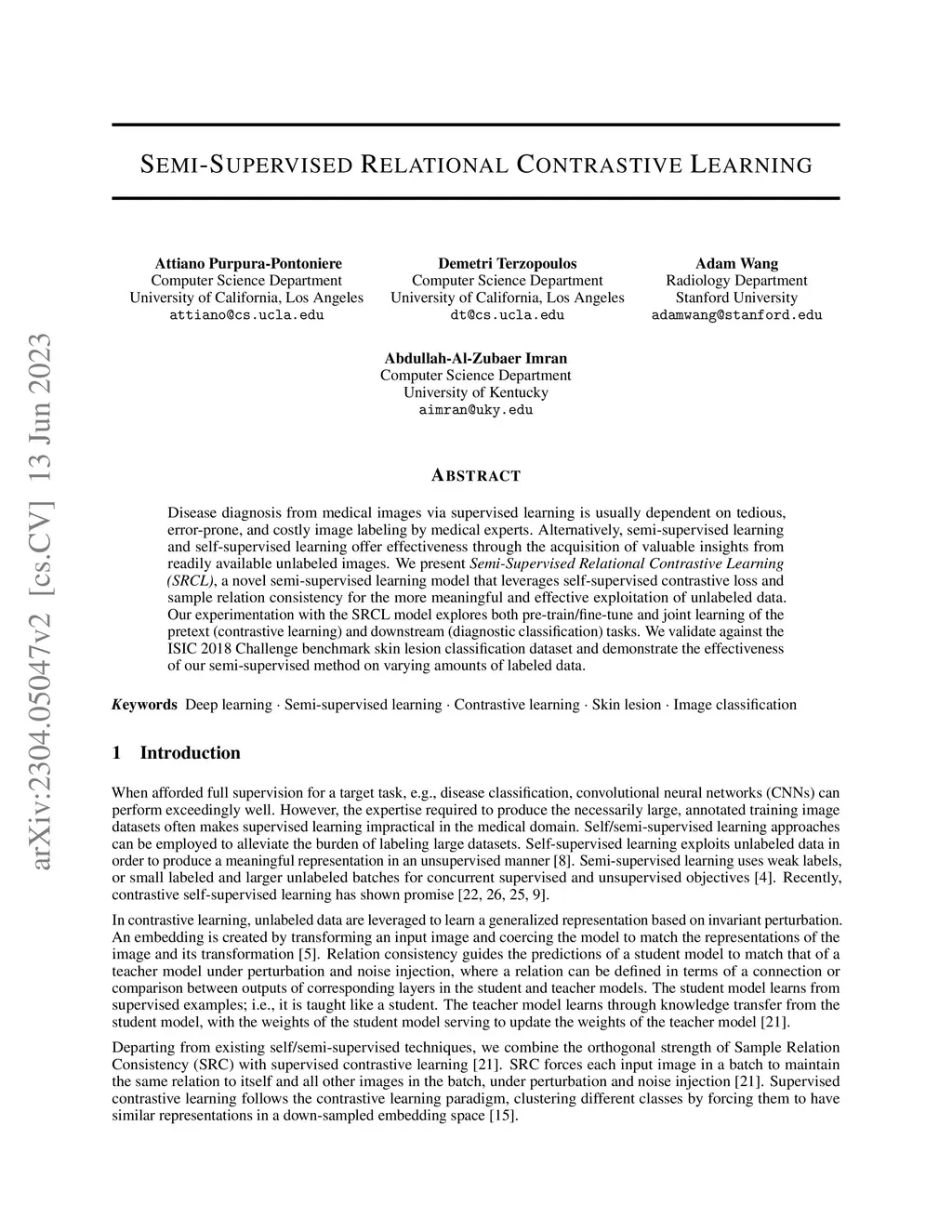 Disease diagnosis from medical images via supervised learning is usually dependent on tedious, error-prone, and costly image labeling by medical experts. Alternatively, semi-supervised learning and self-supervised learning offer effectiveness through the acquisition of valuable insights from readily available unlabeled images. We present Semi-Supervised Relational Contrastive Learning (SRCL), a novel semi-supervised learning model that leverages self-supervised contrastive loss and sample relation consistency for the more meaningful and effective exploitation of unlabeled data. Our experimentation with the SRCL model explores both pre-train/fine-tune and joint learning of the pretext (contrastive learning) and downstream (diagnostic classification) tasks. We validate against the ISIC 2018 Challenge benchmark skin lesion classification dataset and demonstrate the effectiveness of our semi-supervised method on varying amounts of labeled data.
