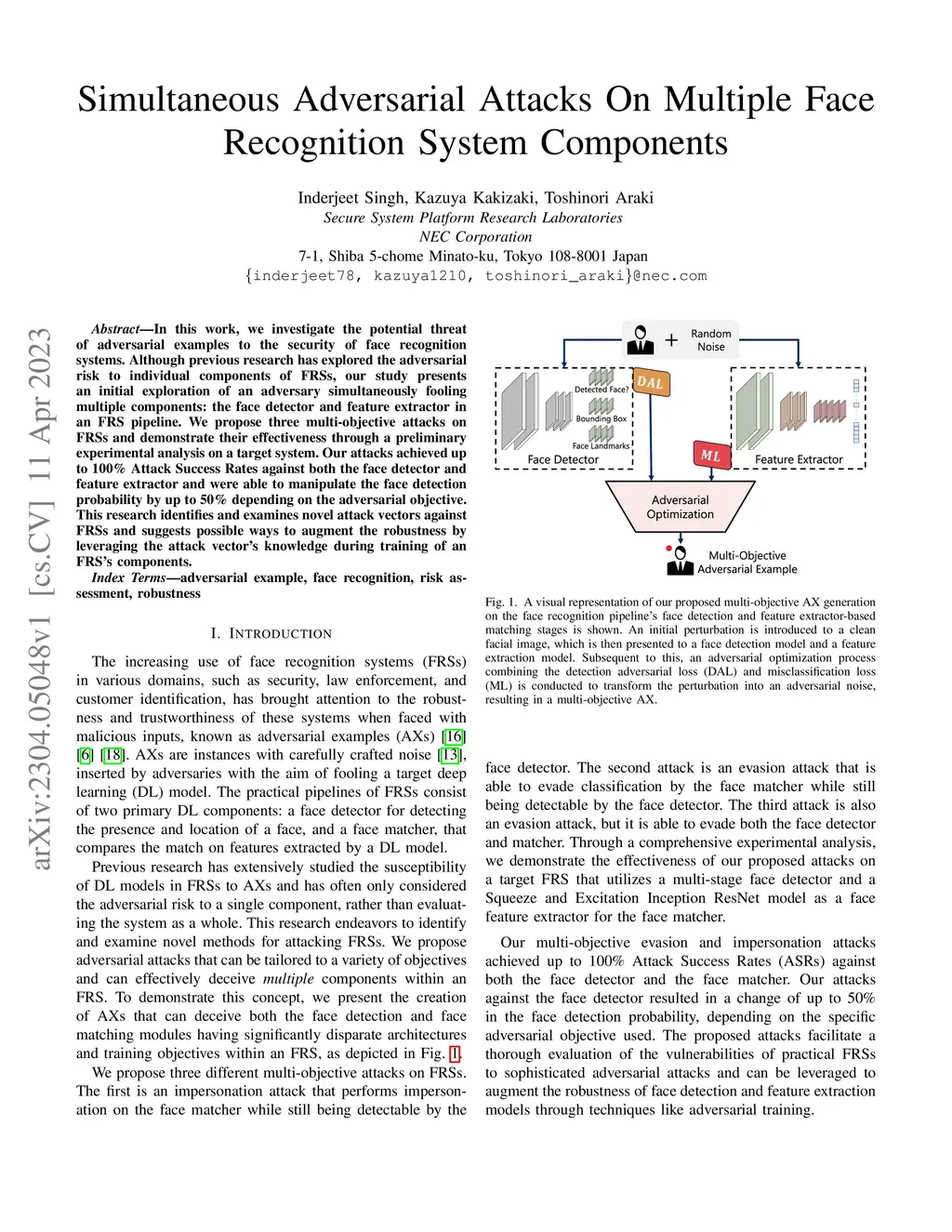In this work, we investigate the potential threat of adversarial examples to the security of face recognition systems. Although previous research has explored the adversarial risk to individual components of FRSs, our study presents an initial exploration of an adversary simultaneously fooling multiple components: the face detector and feature extractor in an FRS pipeline. We propose three multi-objective attacks on FRSs and demonstrate their effectiveness through a preliminary experimental analysis on a target system. Our attacks achieved up to 100% Attack Success Rates against both the face detector and feature extractor and were able to manipulate the face detection probability by up to 50% depending on the adversarial objective. This research identifies and examines novel attack vectors against FRSs and suggests possible ways to augment the robustness by leveraging the attack vector's knowledge during training of an FRS's components.