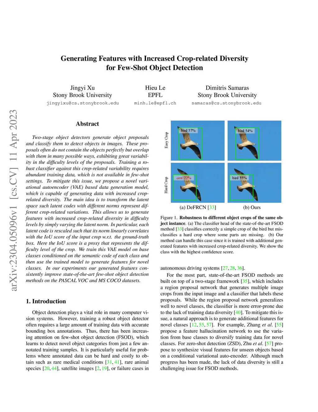 Two-stage object detectors generate object proposals and classify them to detect objects in images. These proposals often do not contain the objects perfectly but overlap with them in many possible ways, exhibiting great variability in the difficulty levels of the proposals. Training a robust classifier against this crop-related variability requires abundant training data, which is not available in few-shot settings. To mitigate this issue, we propose a novel variational autoencoder (VAE) based data generation model, which is capable of generating data with increased crop-related diversity. The main idea is to transform the latent space such latent codes with different norms represent different crop-related variations. This allows us to generate features with increased crop-related diversity in difficulty levels by simply varying the latent norm. In particular, each latent code is rescaled such that its norm linearly correlates with the IoU score of the input crop w.r.t. the ground-truth box. Here the IoU score is a proxy that represents the difficulty level of the crop. We train this VAE model on base classes conditioned on the semantic code of each class and then use the trained model to generate features for novel classes. In our experiments our generated features consistently improve state-of-the-art few-shot object detection methods on the PASCAL VOC and MS COCO datasets.