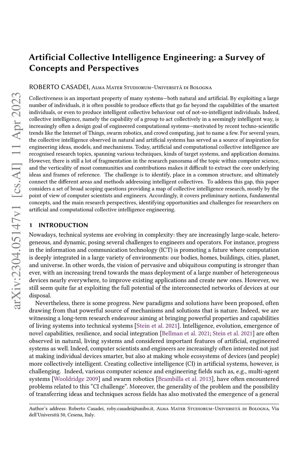 Collectiveness is an important property of many systems--both natural and artificial. By exploiting a large number of individuals, it is often possible to produce effects that go far beyond the capabilities of the smartest individuals, or even to produce intelligent collective behaviour out of not-so-intelligent individuals. Indeed, collective intelligence, namely the capability of a group to act collectively in a seemingly intelligent way, is increasingly often a design goal of engineered computational systems--motivated by recent techno-scientific trends like the Internet of Things, swarm robotics, and crowd computing, just to name a few. For several years, the collective intelligence observed in natural and artificial systems has served as a source of inspiration for engineering ideas, models, and mechanisms. Today, artificial and computational collective intelligence are recognised research topics, spanning various techniques, kinds of target systems, and application domains. However, there is still a lot of fragmentation in the research panorama of the topic within computer science, and the verticality of most communities and contributions makes it difficult to extract the core underlying ideas and frames of reference. The challenge is to identify, place in a common structure, and ultimately connect the different areas and methods addressing intelligent collectives. To address this gap, this paper considers a set of broad scoping questions providing a map of collective intelligence research, mostly by the point of view of computer scientists and engineers. Accordingly, it covers preliminary notions, fundamental concepts, and the main research perspectives, identifying opportunities and challenges for researchers on artificial and computational collective intelligence engineering.