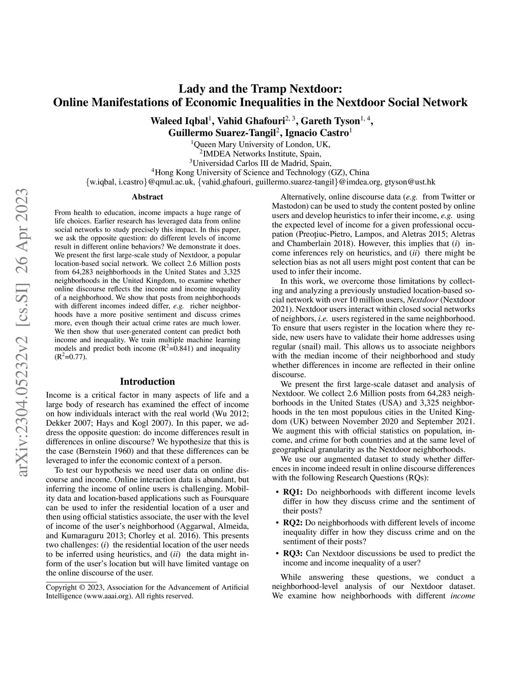 From health to education, income impacts a huge range of life choices. Many papers have leveraged data from online social networks to study precisely this. In this paper, we ask the opposite question: do different levels of income result in different online behaviors? We demonstrate it does. We present the first large-scale study of Nextdoor, a popular location-based social network. We collect 2.6 Million posts from 64,283 neighborhoods in the United States and 3,325 neighborhoods in the United Kingdom, to examine whether online discourse reflects the income and income inequality of a neighborhood. We show that posts from neighborhoods with different income indeed differ, e.g. richer neighborhoods have a more positive sentiment and discuss crimes more, even though their actual crime rates are much lower. We then show that user-generated content can predict both income and inequality. We train multiple machine learning models and predict both income (R-Square=0.841) and inequality (R-Square=0.77).