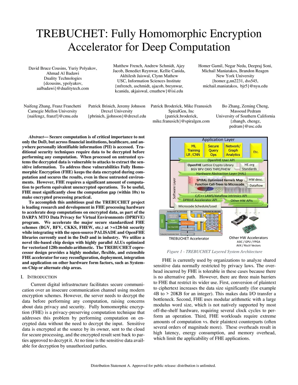 Secure computation is of critical importance to not only the DoD, but across financial institutions, healthcare, and anywhere personally identifiable information (PII) is accessed. Traditional security techniques require data to be decrypted before performing any computation. When processed on untrusted systems the decrypted data is vulnerable to attacks to extract the sensitive information. To address these vulnerabilities Fully Homomorphic Encryption (FHE) keeps the data encrypted during computation and secures the results, even in these untrusted environments. However, FHE requires a significant amount of computation to perform equivalent unencrypted operations. To be useful, FHE must significantly close the computation gap (within 10x) to make encrypted processing practical. To accomplish this ambitious goal the TREBUCHET project is leading research and development in FHE processing hardware to accelerate deep computations on encrypted data, as part of the DARPA MTO Data Privacy for Virtual Environments (DPRIVE) program. We accelerate the major secure standardized FHE schemes (BGV, BFV, CKKS, FHEW, etc.) at >=128-bit security while integrating with the open-source PALISADE and OpenFHE libraries currently used in the DoD and in industry. We utilize a novel tile-based chip design with highly parallel ALUs optimized for vectorized 128b modulo arithmetic. The TREBUCHET coprocessor design provides a highly modular, flexible, and extensible FHE accelerator for easy reconfiguration, deployment, integration and application on other hardware form factors, such as System-on-Chip or alternate chip areas.