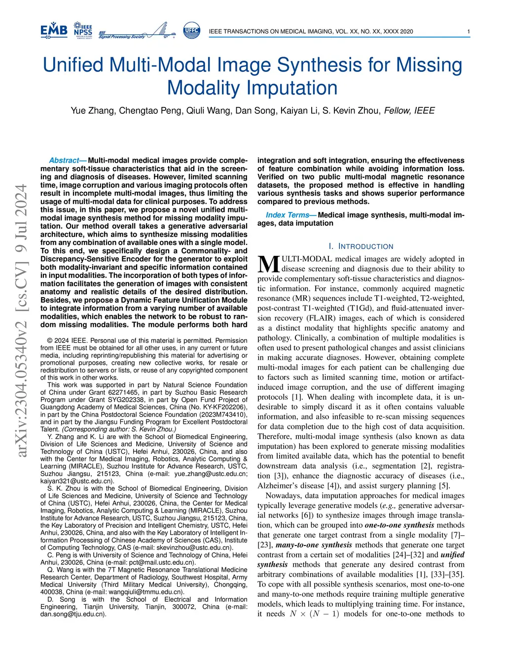 Multi-modal medical images provide complementary soft-tissue characteristics that aid in the screening and diagnosis of diseases. However, limited scanning time, image corruption and various imaging protocols often result in incomplete multi-modal images, thus limiting the usage of multi-modal data for clinical purposes. To address this issue, in this paper, we propose a novel unified multi-modal image synthesis method for missing modality imputation. Our method overall takes a generative adversarial architecture, which aims to synthesize missing modalities from any combination of available ones with a single model. To this end, we specifically design a Commonality- and Discrepancy-Sensitive Encoder for the generator to exploit both modality-invariant and specific information contained in input modalities. The incorporation of both types of information facilitates the generation of images with consistent anatomy and realistic details of the desired distribution. Besides, we propose a Dynamic Feature Unification Module to integrate information from a varying number of available modalities, which enables the network to be robust to random missing modalities. The module performs both hard integration and soft integration, ensuring the effectiveness of feature combination while avoiding information loss. Verified on two public multi-modal magnetic resonance datasets, the proposed method is effective in handling various synthesis tasks and shows superior performance compared to previous methods.