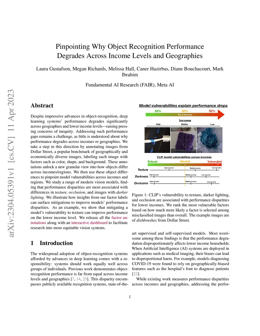 Despite impressive advances in object-recognition, deep learning systems' performance degrades significantly across geographies and lower income levels raising pressing concerns of inequity. Addressing such performance gaps remains a challenge, as little is understood about why performance degrades across incomes or geographies. We take a step in this direction by annotating images from Dollar Street, a popular benchmark of geographically and economically diverse images, labeling each image with factors such as color, shape, and background. These annotations unlock a new granular view into how objects differ across incomes and regions. We then use these object differences to pinpoint model vulnerabilities across incomes and regions. We study a range of modern vision models, finding that performance disparities are most associated with differences in texture, occlusion, and images with darker lighting. We illustrate how insights from our factor labels can surface mitigations to improve models' performance disparities. As an example, we show that mitigating a model's vulnerability to texture can improve performance on the lower income level. We release all the factor annotations along with an interactive dashboard to facilitate research into more equitable vision systems.