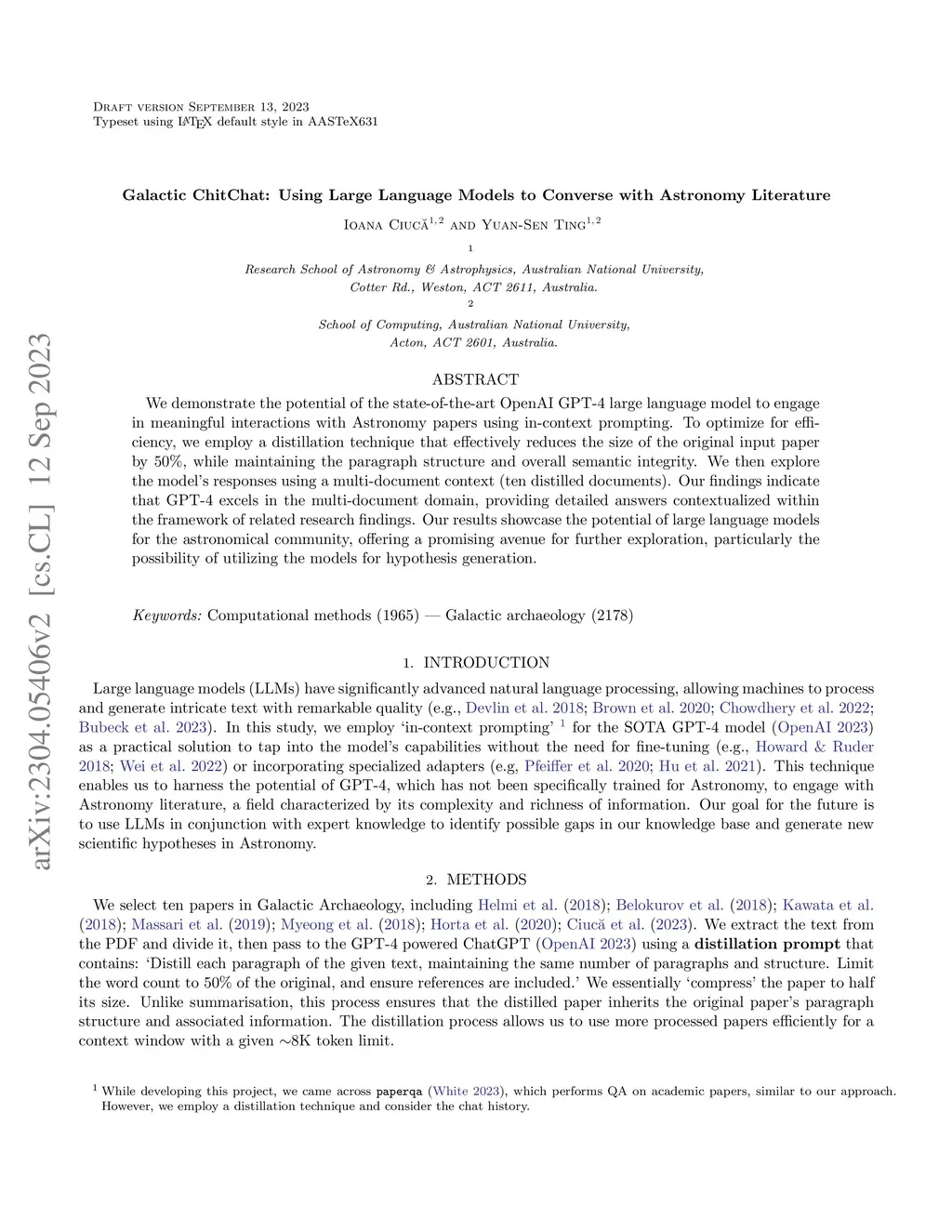 We demonstrate the potential of the state-of-the-art OpenAI GPT-4 large language model to engage in meaningful interactions with Astronomy papers using in-context prompting. To optimize for efficiency, we employ a distillation technique that effectively reduces the size of the original input paper by 50\%, while maintaining the paragraph structure and overall semantic integrity. We then explore the model's responses using a multi-document context (ten distilled documents). Our findings indicate that GPT-4 excels in the multi-document domain, providing detailed answers contextualized within the framework of related research findings. Our results showcase the potential of large language models for the astronomical community, offering a promising avenue for further exploration, particularly the possibility of utilizing the models for hypothesis generation.