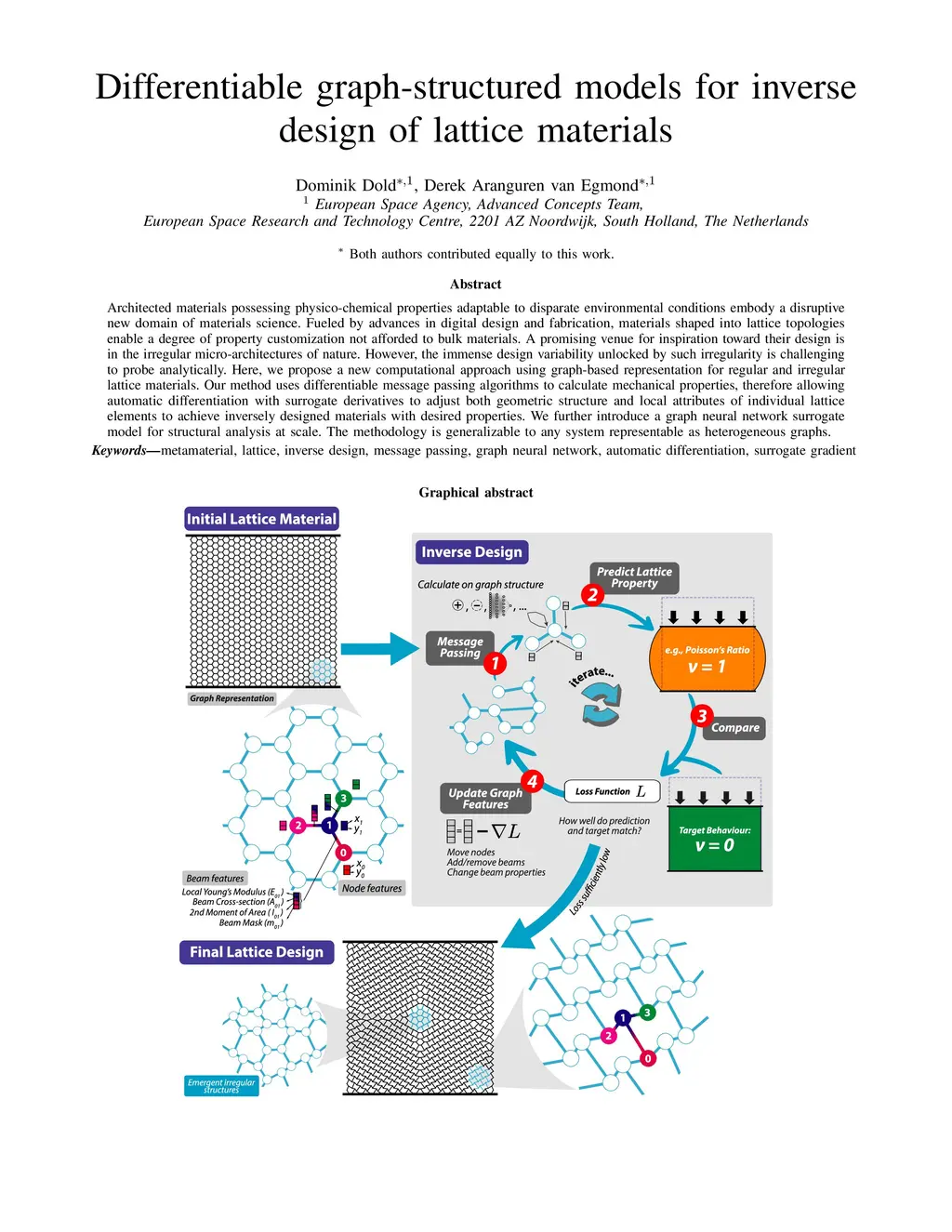 Architected materials possessing physico-chemical properties adaptable to disparate environmental conditions embody a disruptive new domain of materials science. Fueled by advances in digital design and fabrication, materials shaped into lattice topologies enable a degree of property customization not afforded to bulk materials. A promising venue for inspiration toward their design is in the irregular micro-architectures of nature. However, the immense design variability unlocked by such irregularity is challenging to probe analytically. Here, we propose a new computational approach using graph-based representation for regular and irregular lattice materials. Our method uses differentiable message passing algorithms to calculate mechanical properties, therefore allowing automatic differentiation with surrogate derivatives to adjust both geometric structure and local attributes of individual lattice elements to achieve inversely designed materials with desired properties. We further introduce a graph neural network surrogate model for structural analysis at scale. The methodology is generalizable to any system representable as heterogeneous graphs.