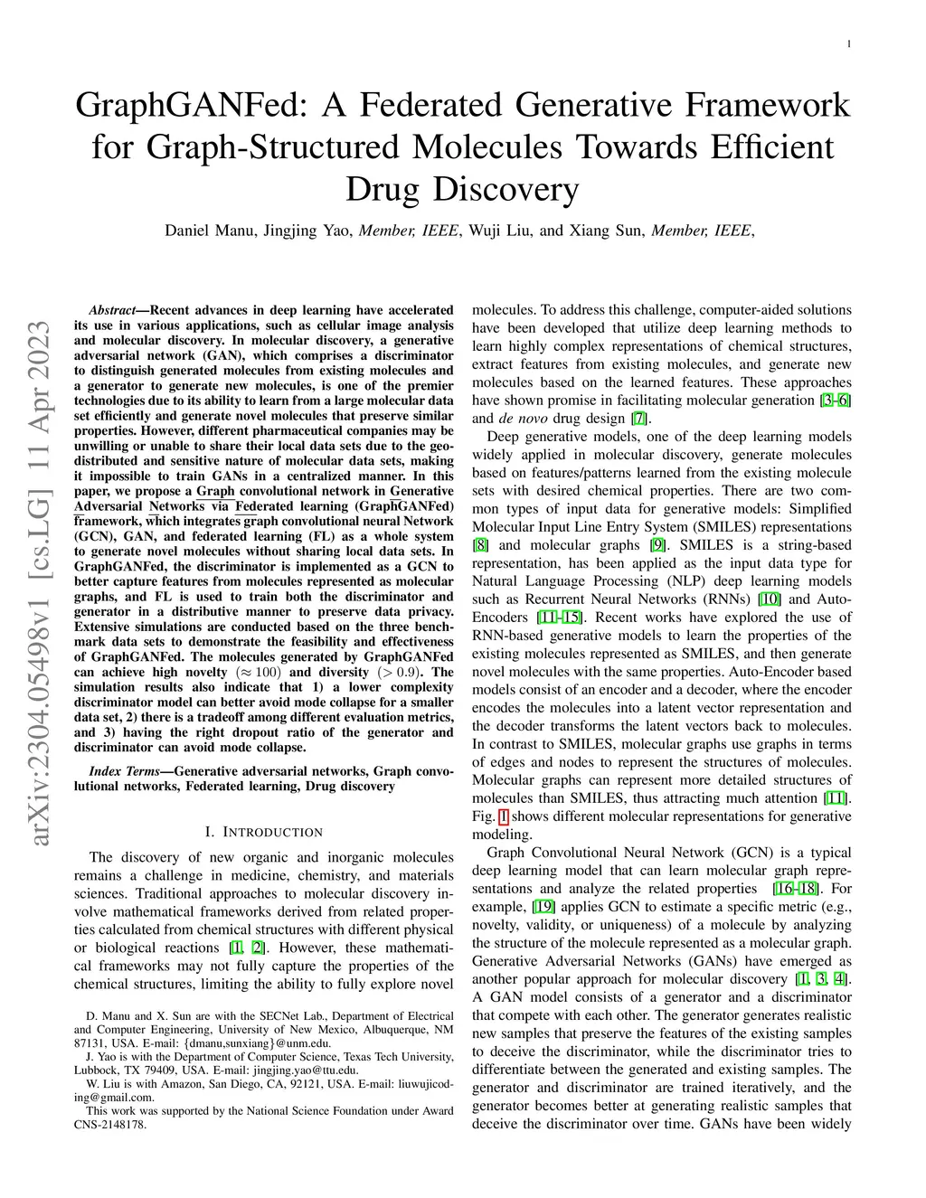 Recent advances in deep learning have accelerated its use in various applications, such as cellular image analysis and molecular discovery. In molecular discovery, a generative adversarial network (GAN), which comprises a discriminator to distinguish generated molecules from existing molecules and a generator to generate new molecules, is one of the premier technologies due to its ability to learn from a large molecular data set efficiently and generate novel molecules that preserve similar properties. However, different pharmaceutical companies may be unwilling or unable to share their local data sets due to the geo-distributed and sensitive nature of molecular data sets, making it impossible to train GANs in a centralized manner. In this paper, we propose a Graph convolutional network in Generative Adversarial Networks via Federated learning (GraphGANFed) framework, which integrates graph convolutional neural Network (GCN), GAN, and federated learning (FL) as a whole system to generate novel molecules without sharing local data sets. In GraphGANFed, the discriminator is implemented as a GCN to better capture features from molecules represented as molecular graphs, and FL is used to train both the discriminator and generator in a distributive manner to preserve data privacy. Extensive simulations are conducted based on the three bench-mark data sets to demonstrate the feasibility and effectiveness of GraphGANFed. The molecules generated by GraphGANFed can achieve high novelty (=100) and diversity (> 0.9). The simulation results also indicate that 1) a lower complexity discriminator model can better avoid mode collapse for a smaller data set, 2) there is a tradeoff among different evaluation metrics, and 3) having the right dropout ratio of the generator and discriminator can avoid mode collapse.